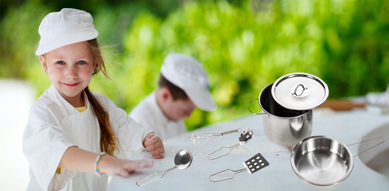 Металлический кухонный гарнитур для детей-кухонные принадлежности для детей и металлические Горшки разного размера.
