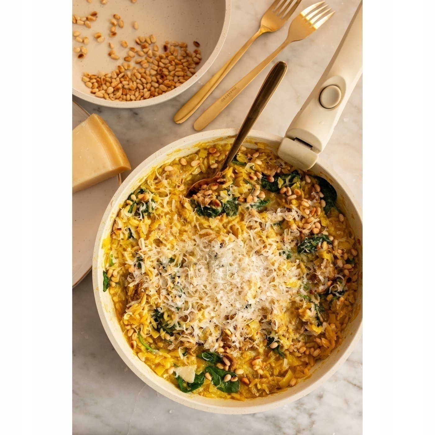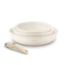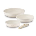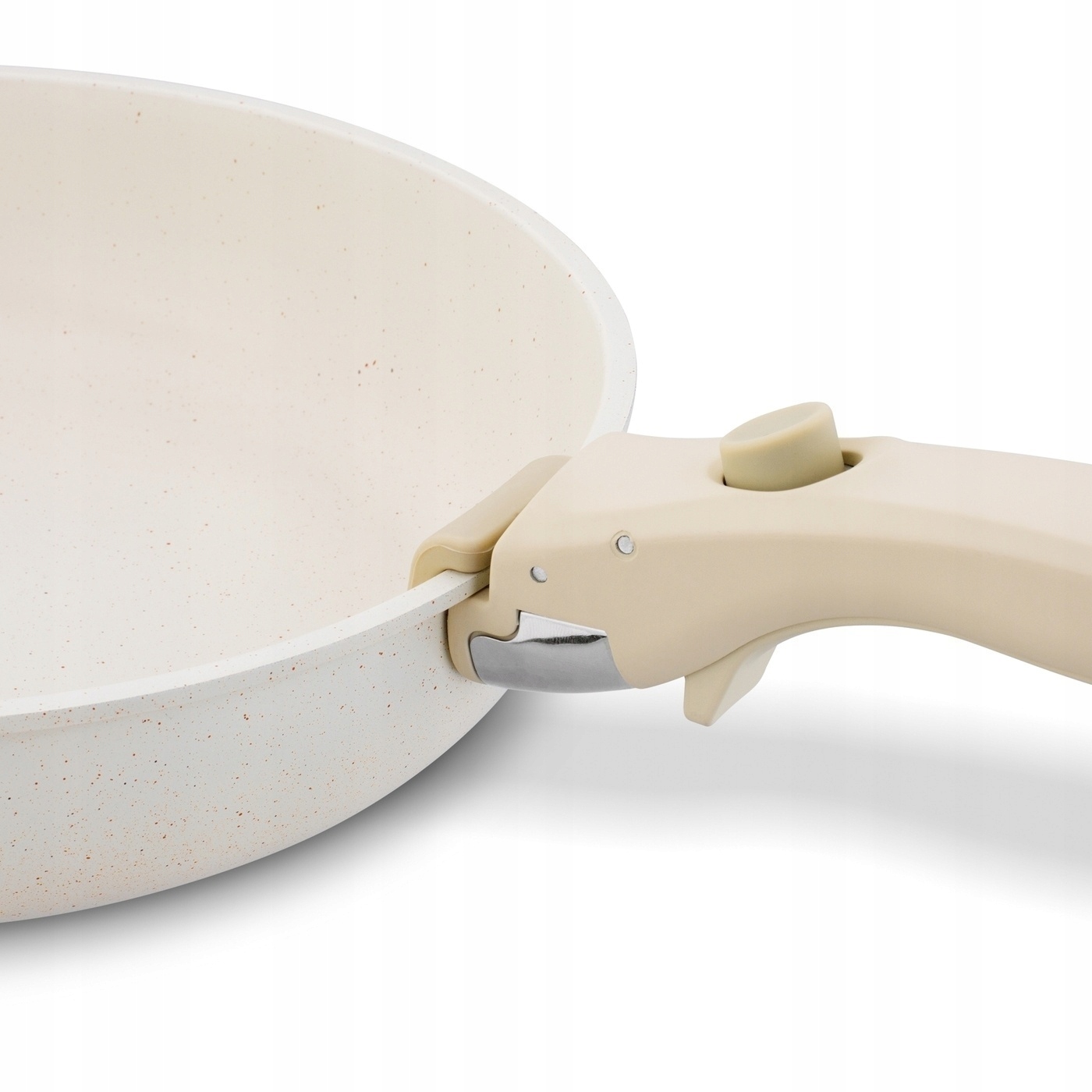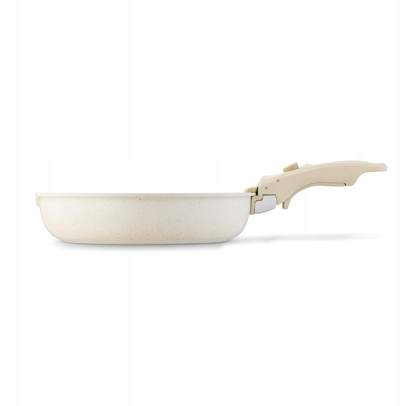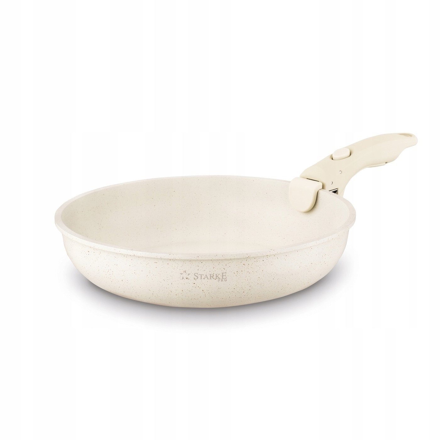 Komplet patelni z powłoką marmurową non-stick Starke Pro Compacti Cream 20 / 24 / 28 cm wykonany jest z aluminium. To jednorodny odlew die cast. Dzięki temu korpusy są świetnie wyważone i poręczne. Podwyższoną trwałość zapewnia tu powłoka MARBLE PLUS typu stone. Jej wysoka jakość, twardość oraz 3-warstwowa struktura zostały przystosowane do wieloletniego użytkowania. Ma też oznaczenie PFOA Free. Energooszczędność daje dno indukcyjne. To dzięki niemu możesz używać 3 patelni Compacti na każdej kuchence. Powłoka nieprzywierająca umożliwi ci dodatkowo smażenie na niewielkiej ilości tłuszczu oraz bezproblemową pielęgnację. Zniesie przy tym aż 10 000 cykli ścierania, czyli pięciokrotnie więcej niż zwykłe naczynia non-stick dostępne na rynku. Przenoszenie i użytkowanie zestawu ułatwia rączka soft touch, która się nie nagrzewa i pewnie leży w dłoni. Jest ona uniwersalna i odpinana, a więc pasuje do każdej średnicy patelni z zestawu Compacti. Z jej pomocą o wiele łatwiej zmieścisz naczynia w kuchennej szafce lub szufladzie. Z tym kompletem bez problemu stworzysz też swój własny zestaw naczyń kuchennych do domowego użytku i dla całej rodziny. W ogólnych testach wytrzymałości zestaw patelni uniwersalnych otrzymał 5/6 gwiazdek. Naczynia te nadają się też do piekarnika - max. w 220 st. C, jednak bez rączki soft touch. Seria Starke Pro Compacti Cream z powłoką typu stone była testowana także przez zawodowego szefa kuchni, Piotra Kucharskiego. Poleca on ją do wieloletniego użytku w domowej kuchni. To jedna z najlepszych opcji w tej kategorii!