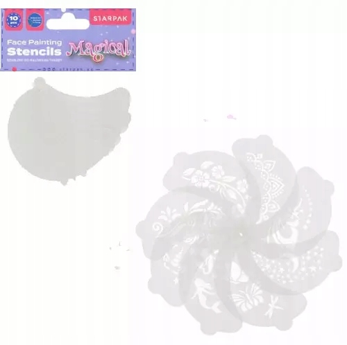 Zalety produktu szablonów do twarzy STARPAK to niezastąpiony sposób na urozmaicenie przyjęć, urodzin i innych wydarzeń. Bez nich zabawa nie będzie pełna. Dzięki szablonom Magical STARPAK mamy gwarancję udanej imprezy. Szablony występują w różnych wzorach, jak np. kwiaty, motylki, jednorożec, księżyc, gwiazdki, syrenka... W zestawie znajduje się 10 szablonów. Są one wykonane z plastiku. Wymiary produktu: wysokość x szerokość - 13x7 cm, waga produktu - 0,04 kg, wymiary opakowania: szerokość x głębokość - 19x12 cm, waga opakowania - 0,05 kg. Zestaw pakowany jest w woreczek z zawieszką. Opakowanie wewnętrzne zawiera 24 sztuki, a karton zawiera 144 sztuki.