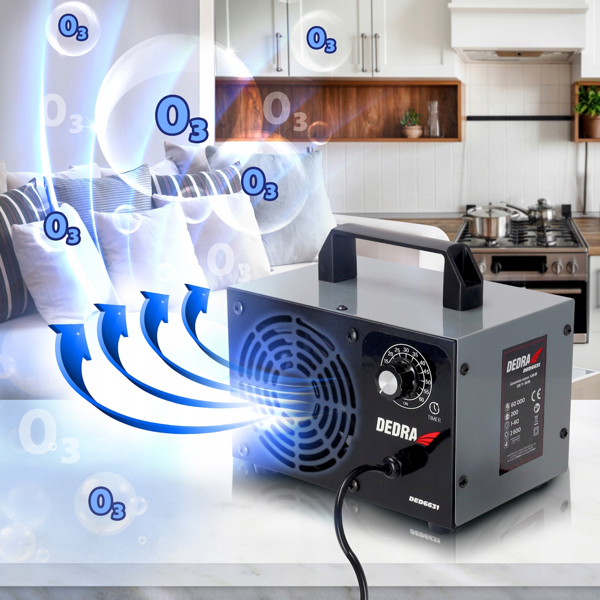 Profesjonalny ozonator DEDRA DED6631 to urządzenie, które generuje ozon (O₃) i stosowane jest do dezynfekcji powietrza, usuwania zapachów oraz eliminacji alergenów. Skutecznie niszczy bakterie, wirusy, pleśnie i inne patogeny obecne w powietrzu. Neutralizuje nieprzyjemne zapachy dymu papierosowego, pleśni, wilgoci oraz pomaga usuwać kurz, roztocza oraz pyłki. Pomoże również przy odgrzybianiu ścian i klimatyzacji.