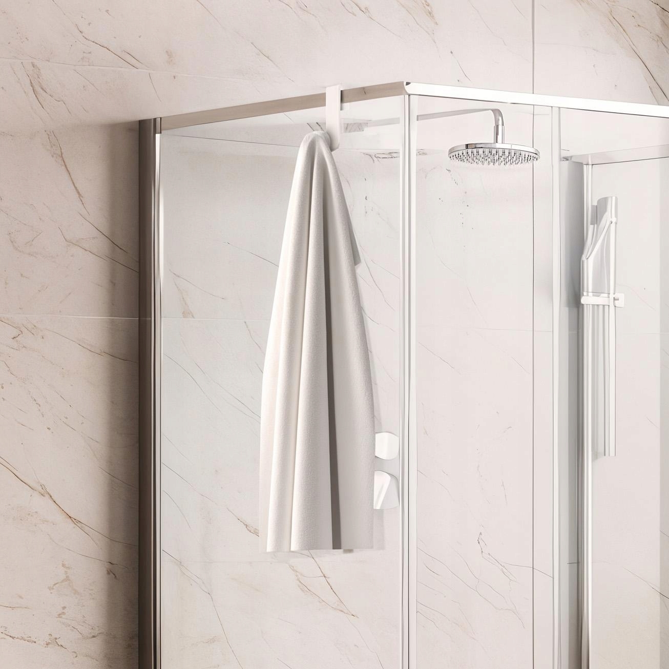 Dzięki specjalnemu profilowi, haczyki można łatwo zaczepić na krawędzi kabiny prysznicowej bez ryzyka uszkodzenia szkła. Umożliwiają wygodne przechowywanie ręcznika kąpielowego w zasięgu ręki.