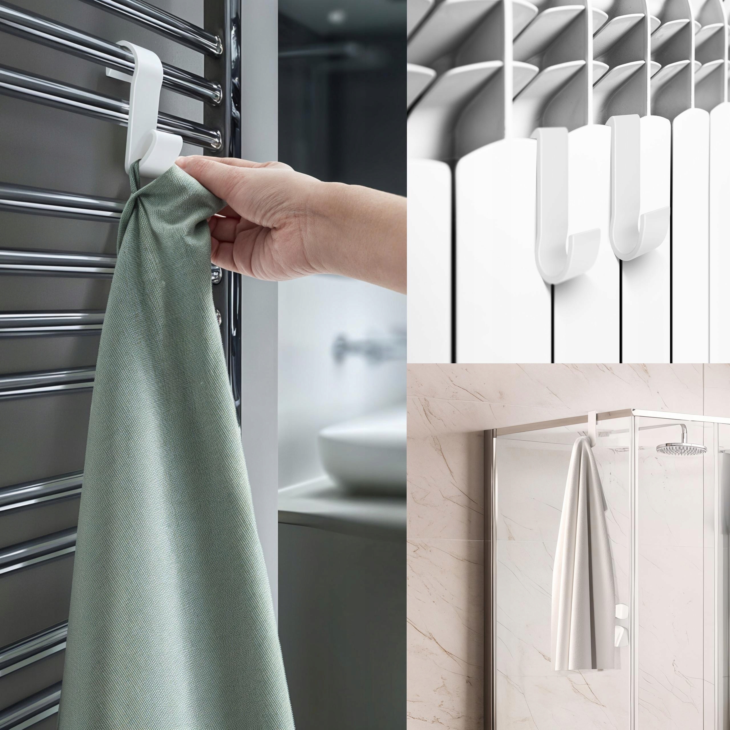 Haczyki doskonale pasują do większości standardowych grzejników. Można na nich wygodnie powiesić ręczniki, które szybko wyschną dzięki ciepłu emitowanemu przez grzejnik. To idealne rozwiązanie, gdy brakuje miejsca na osobny wieszak.