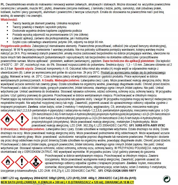Uwaga. Profesjonalny produkt dwuskładnikowy renomowany przez firmy specjalizujące się w renowacji wanien.