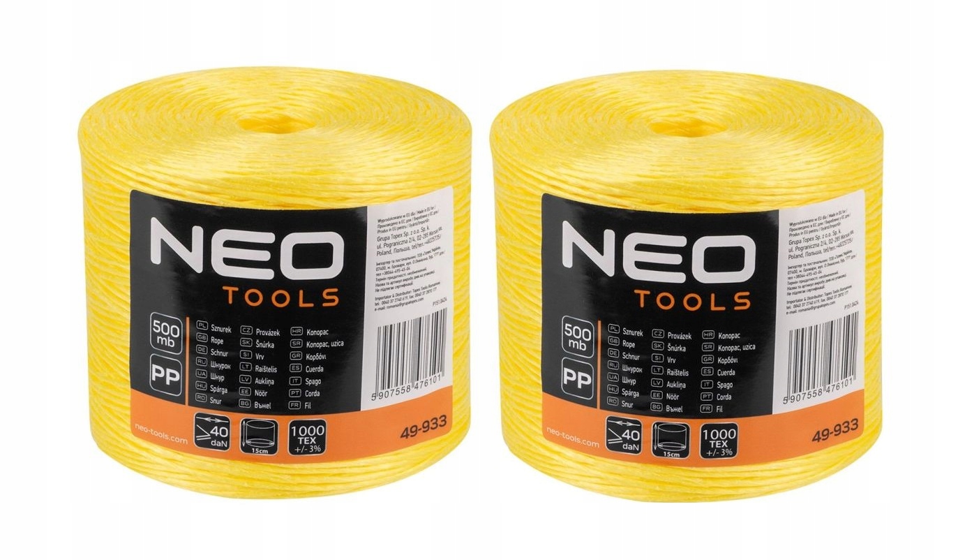 Sznurek polipropylenowy 500 m 49-933 marki NEO TOOLS to wytrzymały sznurek z polipropylenu o długości 500 mb w kłębku. Charakteryzuje się grubością nici tex 1850 oraz wytrzymałością (DAN) 41+/-5%. Posiada średnicę 15 cm oraz wysokość 15 cm. To lekki i wytrzymały sznurek NEO TOOLS, przeznaczony do podwieszania wełny mineralnej, podwiązywania roślin i pakowania. Może być wykorzystywany w przemyśle rolniczym, budowniczym oraz każdym gospodarstwie domowym.