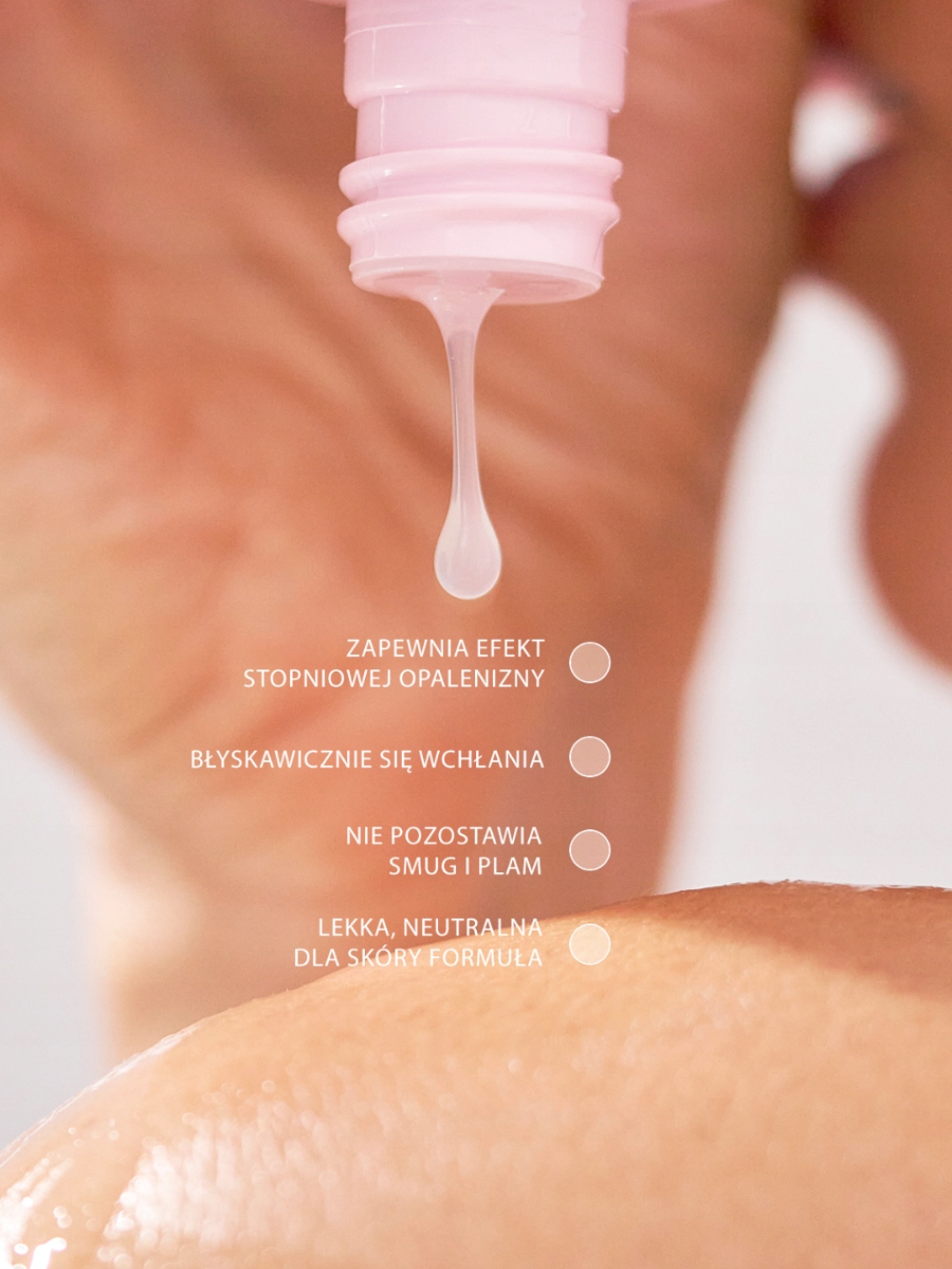 SELF TAN WATER to produkt o niewyczuwalnej formule, która jest niezwykle lekka i przyjemna w aplikacji. Błyskawicznie się wchłania, nie pozostawiając smug ani tłustych śladów, co sprawia, że już po chwili możesz zaaplikować kosmetyki pielęgnacyjne czy nałożyć ubranie. Lekka formuła jest neutralna dla skóry, niemal jak woda – nie zapycha porówi jest odpowiednia dla każdego typu skóry. SELF TAN WATER możesz stosować solo lub w połączeniu z ulubionym serum lub kremem, co pozwala na łatwe wkomponowanie produktu w codzienną pielęgnację skóry.