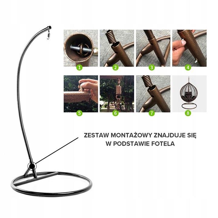 ✅ Zestaw akcesoriów: W zestawie znajduje się wszystko, co potrzebne do montażu i użytkowania fotela, włącznie ze stabilną podstawą, stelażem, śrubami, sprężyną i grubym łańcuchem z możliwością regulacji wysokości. Kompletny zestaw montażowy znajduje się w podstawie fotela.