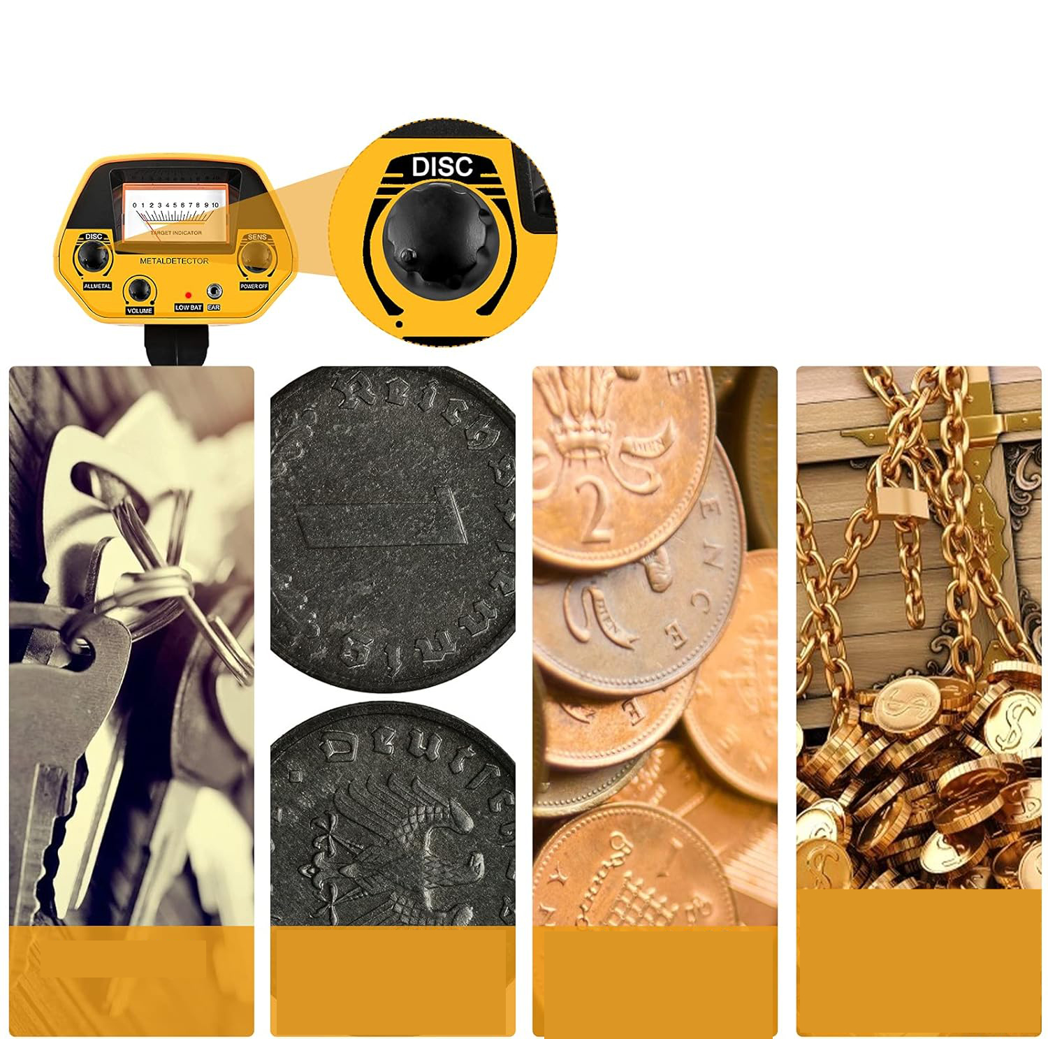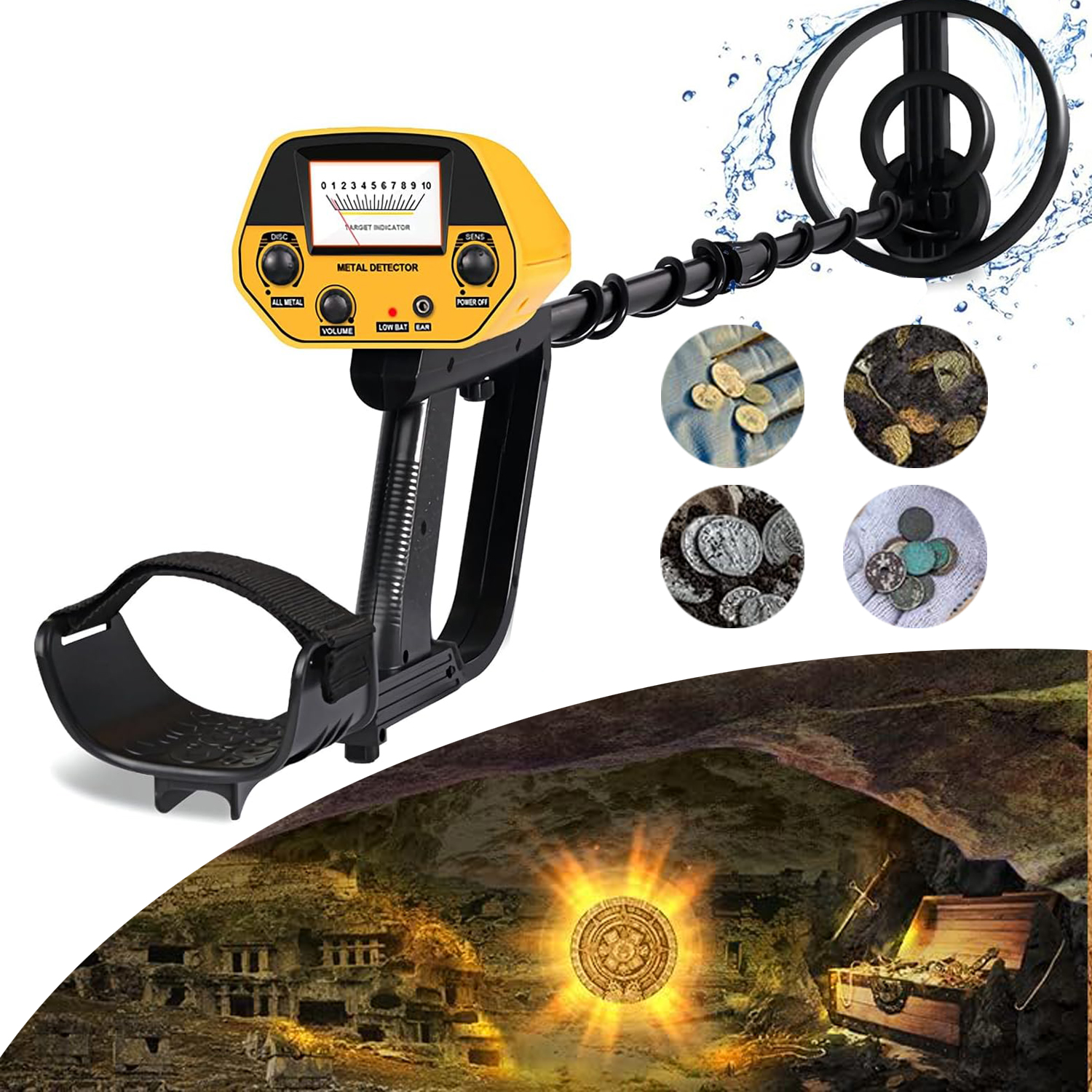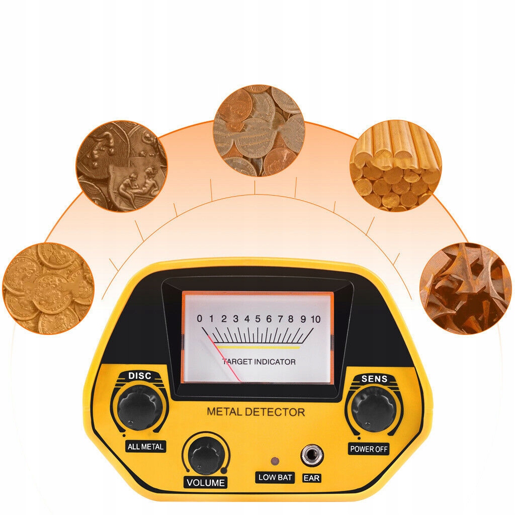 - Dzięki regulowanej głośności i wyświetlaczowi wskaźnikowemu można go używać do wykrywania metali, monet, skarbów itp.