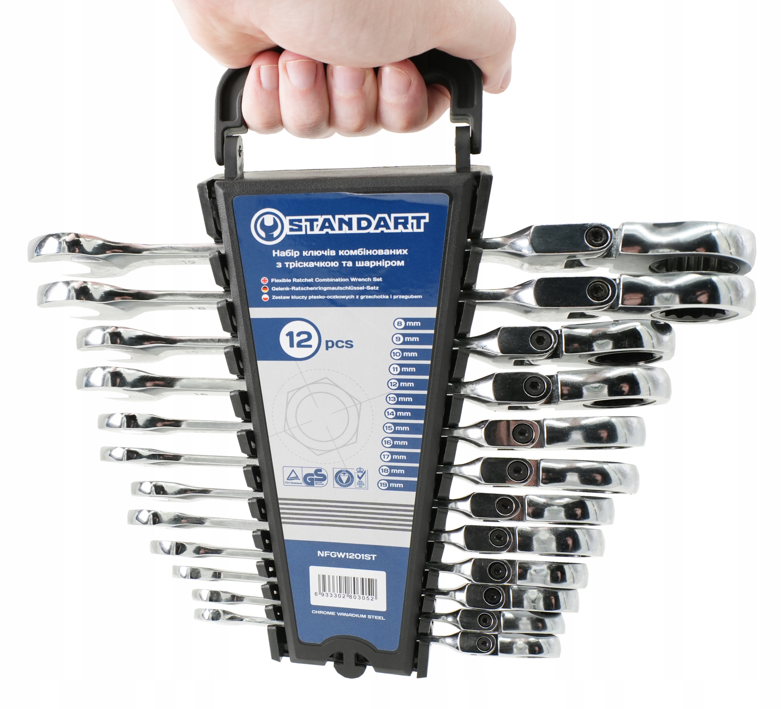 Profesjonalny zestaw 12 kluczy płasko-oczkowych marki STANDART wyposażonych w grzechotkę oraz ruchomy przegub oczkowy, który umożliwia pracę pod różnymi kątami. Idealny wybór zarówno dla profesjonalistów, jak i majsterkowiczów poszukujących wygodnych i funkcjonalnych narzędzi.