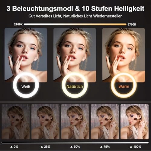 【Dobre ring light do fotografii】Ring light składa się z 120 żarówek LED i oferuje 3 regulowane kolory - światło białe, ciepłe i naturalne - oraz 10 poziomów jasności, co daje łącznie 30 opcji, które spełnią wszystkie Twoje potrzeby w różnych sytuacjach, np. podczas fotografowania, streamingu, makijażu, tworzenia treści itp. Temperatura wynosi od 3300K do 6700K, co sprawia, że światło podczas użytkowania wydaje się bardziej naturalne
