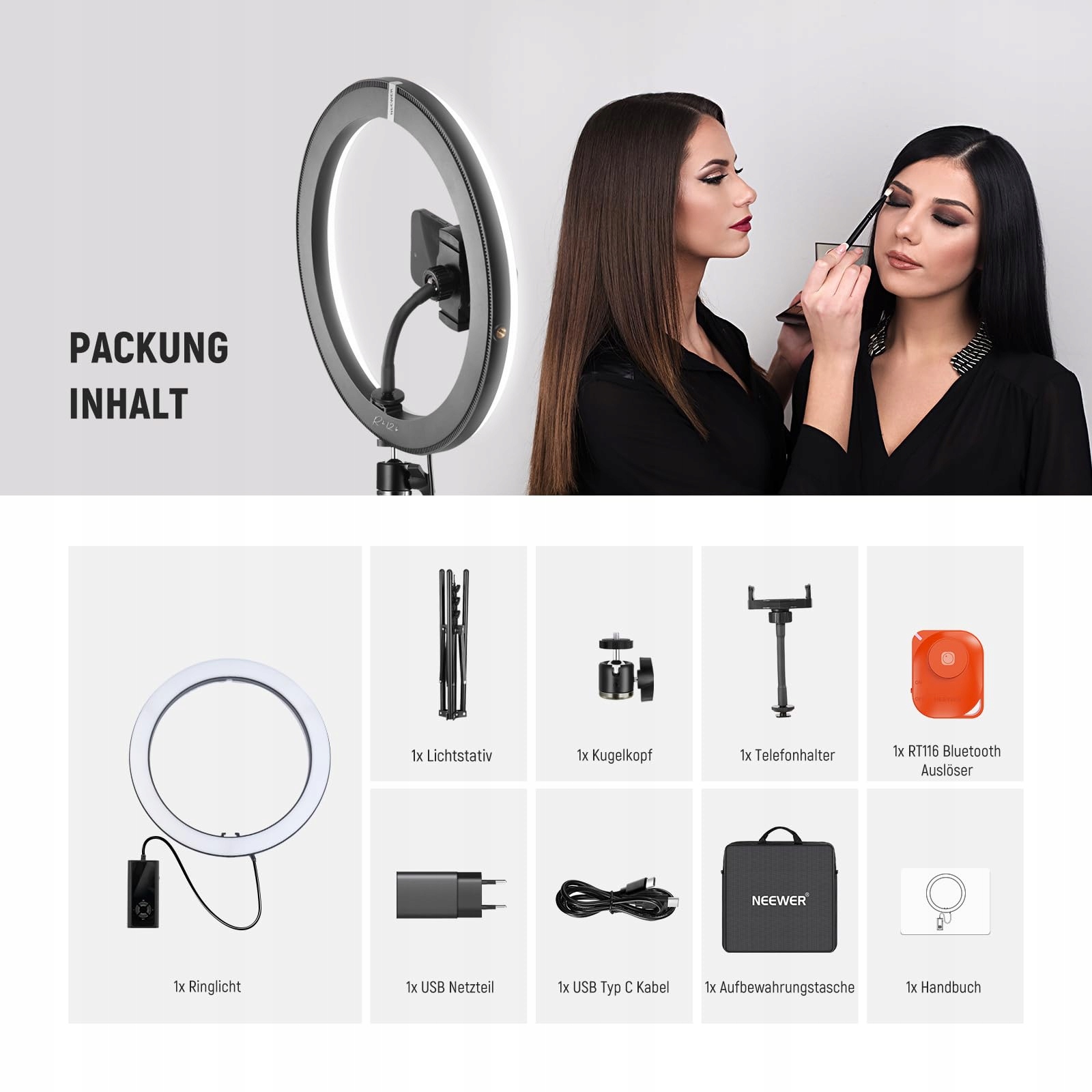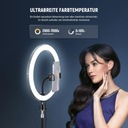 Potężne dwukolorowe Ring Light o mocy 24W do makijażu, transmisji na żywo, połączeń Zoom, TikTok i selfie. 180 diod LED (90 zimnobiałych i 90 ciepłobiałych), ściemnianie od 0 do 100%, jasność 1810lux/0,5m oraz CRI97+/TLCI98+ Ringlight tworzy jasne, rozproszone, równomierne źródło światła o doskonałej dokładności kolorów