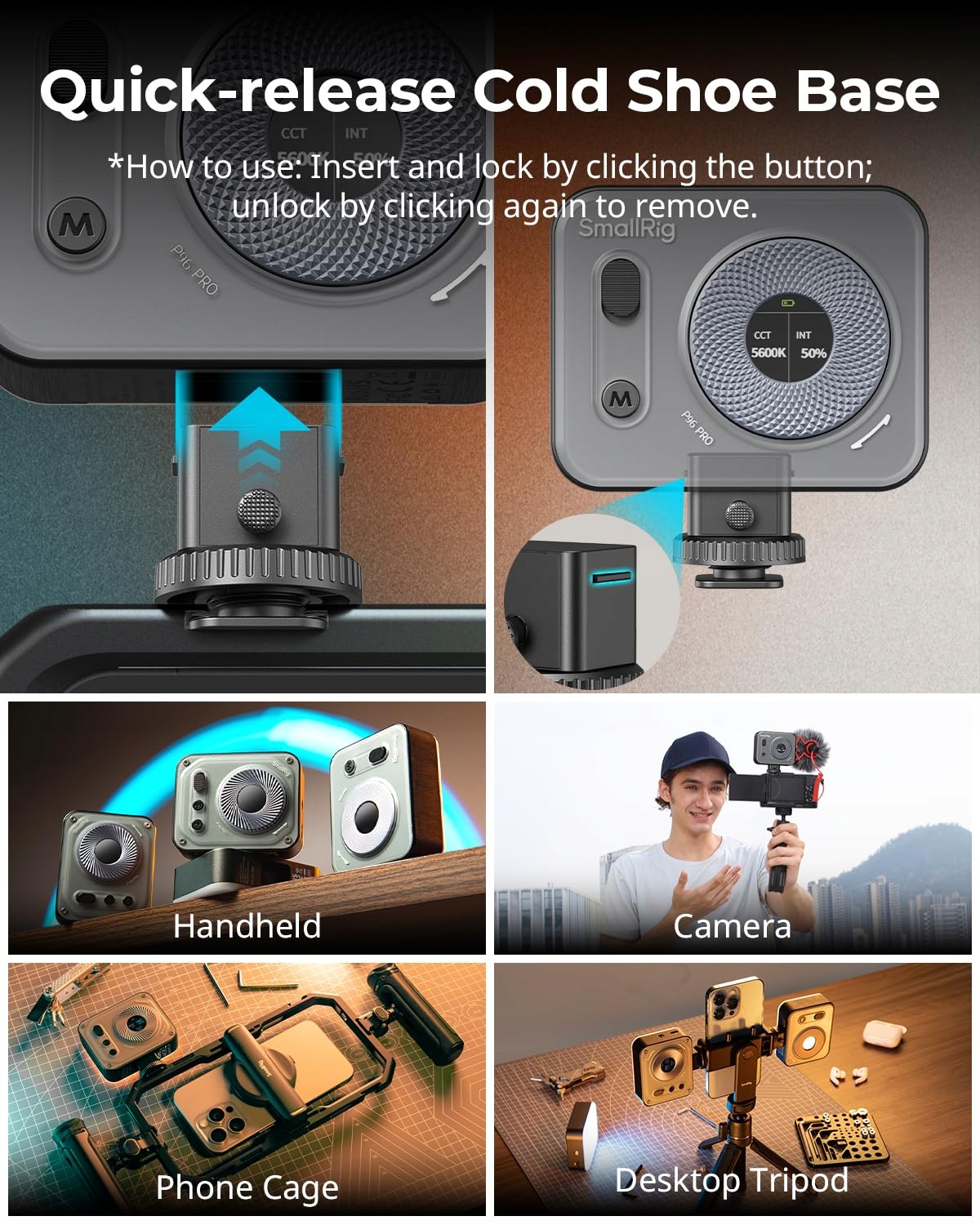 SMALLRIG Vibe P96 Pro LED-Videoświatło, przenośne światło do kamery do fotografii, światło na zimny but, CRI95+, 2500-6500K, 5 efektów, akcesoria do oświetlenia dla twórców treści, streaming czarne 4660