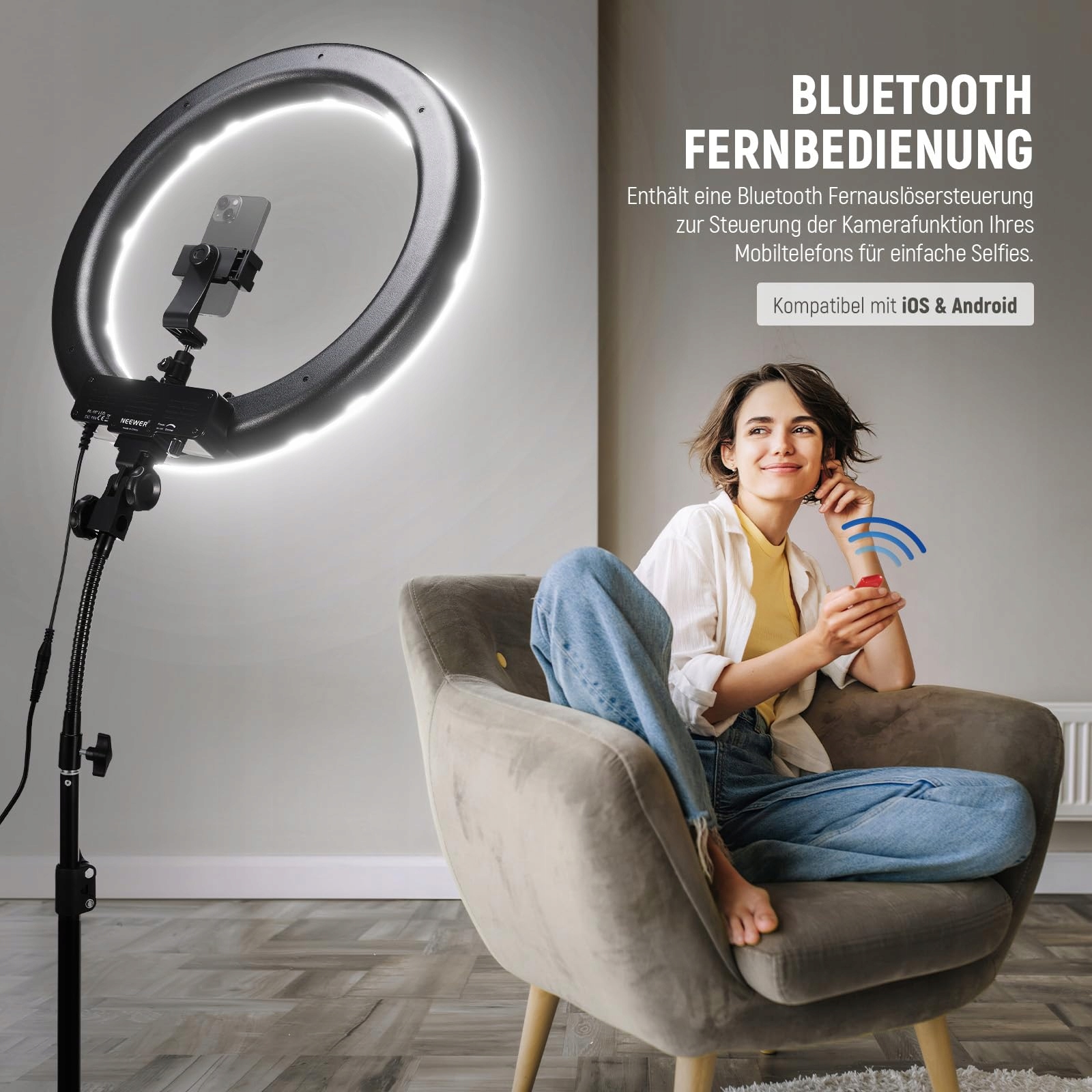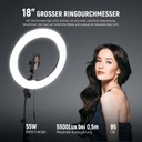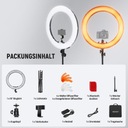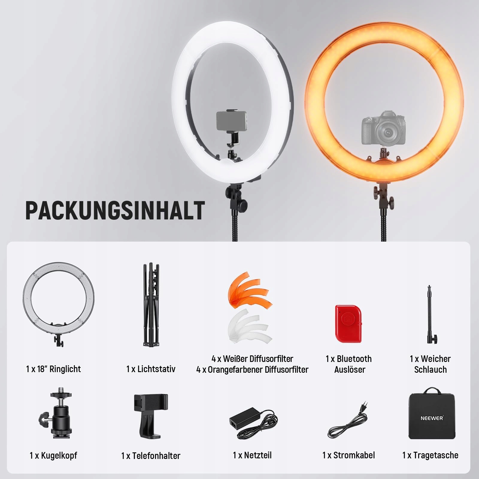 Zestaw zawiera: 45 cm 55 W LED Ringlight + 155 cm stojak na światło + Soft Tube + zestaw filtrów kolorowych + głowica kulowa adapter Hot Shoe + uniwersalny adapter zasilania z wtyczką + uchwyt do smartfona + torba do przenoszenia pierścienia świetlnego, idealna do nagrywania wideo, streamingu na żywo, selfie