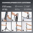 Stojak świetlny 155 cm jest wykonany ze stopu aluminium i jest najbardziej stabilny, gdy środkowy staw nóg znajduje się 10-20 cm od podłoża. Należy pamiętać, że zbyt wysokie podnoszenie nóg może spowodować, że statyw świetlny spadnie