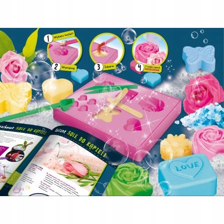 Zestaw do tworzenia mydełek o fantazyjnych kształtach! W opakowaniu znajdziesz niezbędne składniki i narzędzia, by bezpiecznie eksperymentować w domu. Przygotuj glicerynę i użyj foremki. Podaruj mydełka swoim przyjaciółkom. Ilustrowany przewodnik krok po kroku wyjaśni ci, jak wykonać mydełka. Dowiesz się z niego wielu ciekawostek na temat pięknie pachnącej historii mydła. Dla dzieci w wieku od 8 lat.