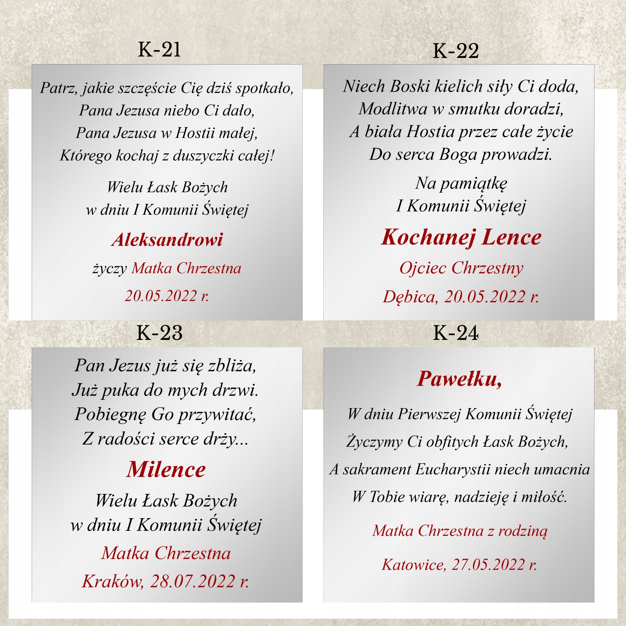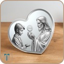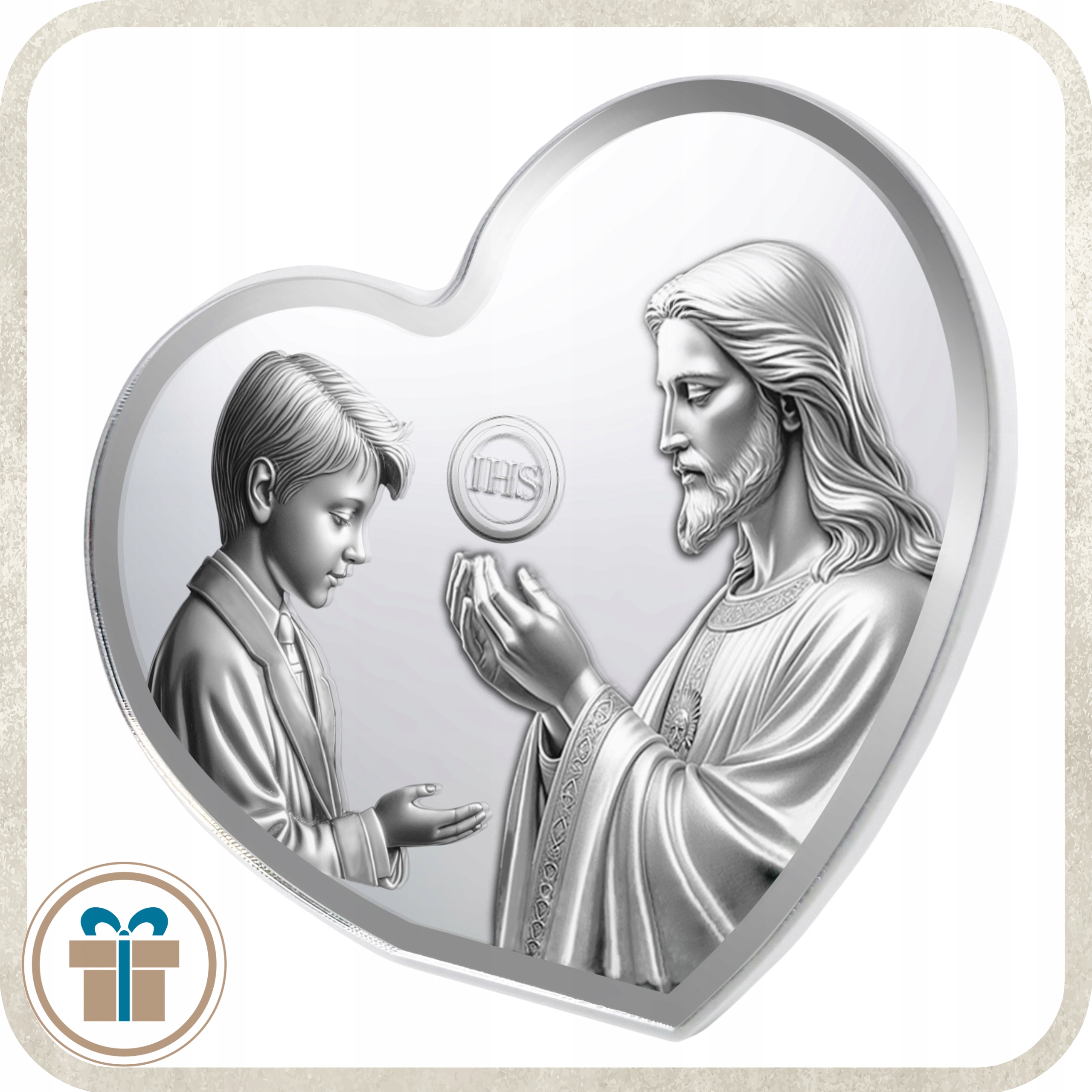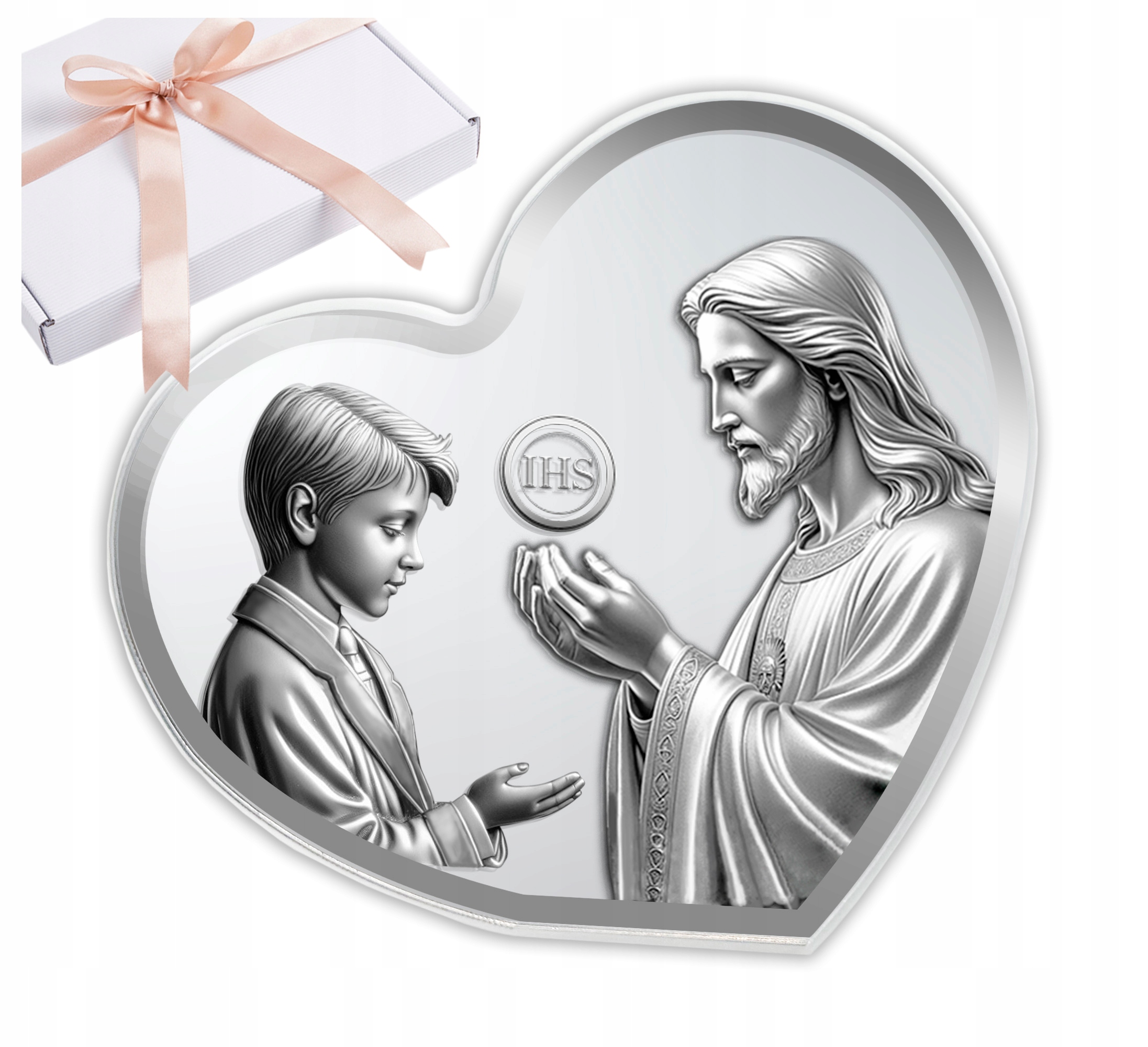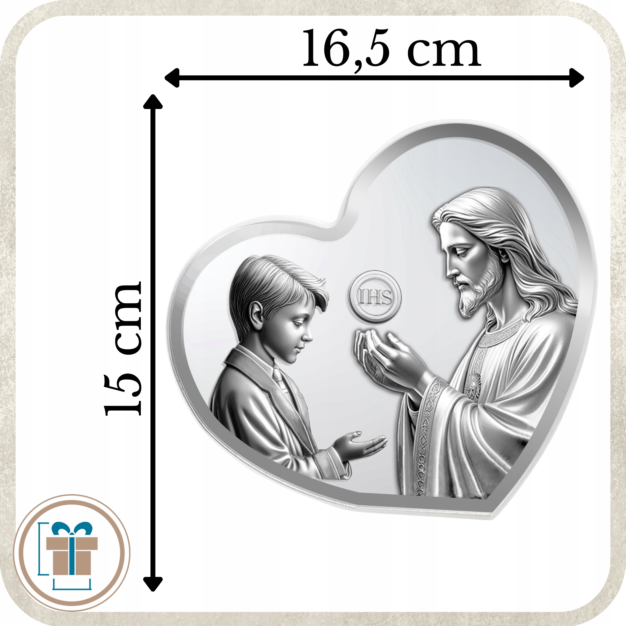 Elegancki obrazek z wizerunkiem chłopca przyjmującego Komunię Świętą to wyjątkowa pamiątka Pierwszej Komunii Świętej. Wykonany z materiału o lustrzanym efekcie, doskonale odbija światło i prezentuje się niezwykle estetycznie.