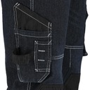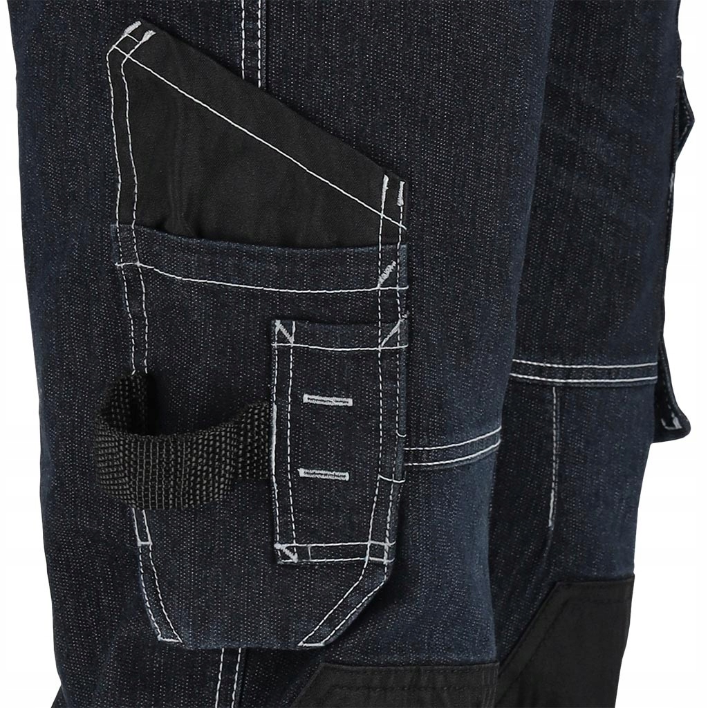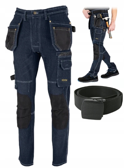 Elastyczne spodnie robocze męskie do pasa, idealne dla monterów i pracowników technicznych. Wykonane z trwałej tkaniny jeansowej (bawełna, poliester, wiskoza, elastan) z wzmocnieniami z Cordury. Posiadają liczne kieszenie: boczne, tylne, monterskie, na nogawkach oraz na wkładki nakolannikowe. Wyposażone w uchwyt na młotek i pętelki na akcesoria. Zapinane na guzik i zamek. Komfortowe, odporne na przetarcia, zapewniają swobodę ruchów i funkcjonalność w pracy. Idealne spodnie robocze dla profesjonalistów.
