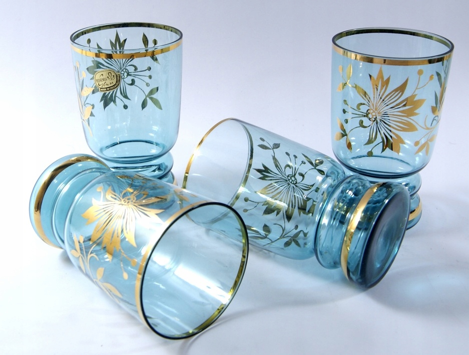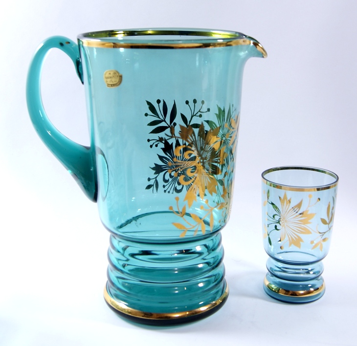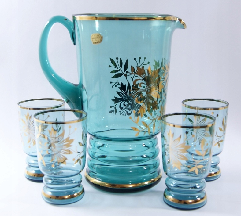 Śliczny, stary dzbanek + 4 szklanki wykonany z kolorowego szkła kryształowego, wzór złoceniem, piękny kolor.