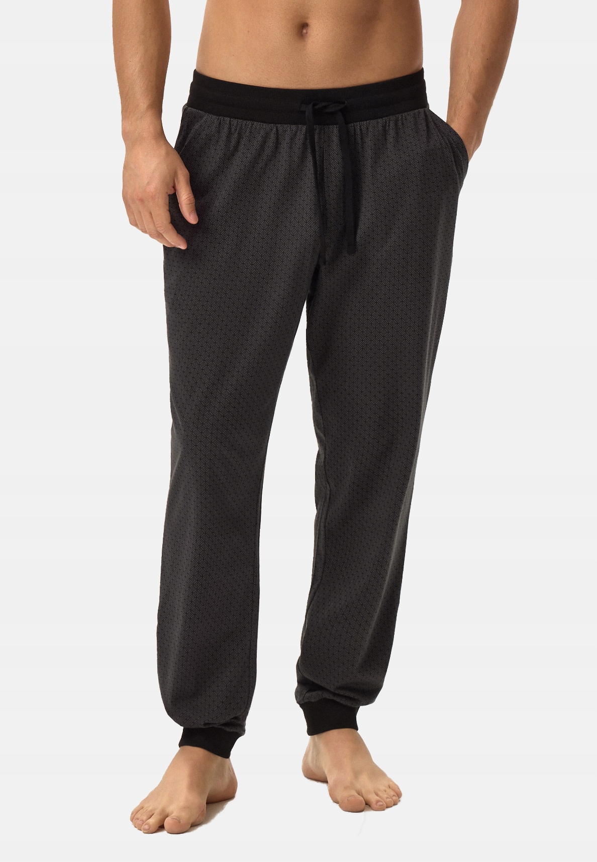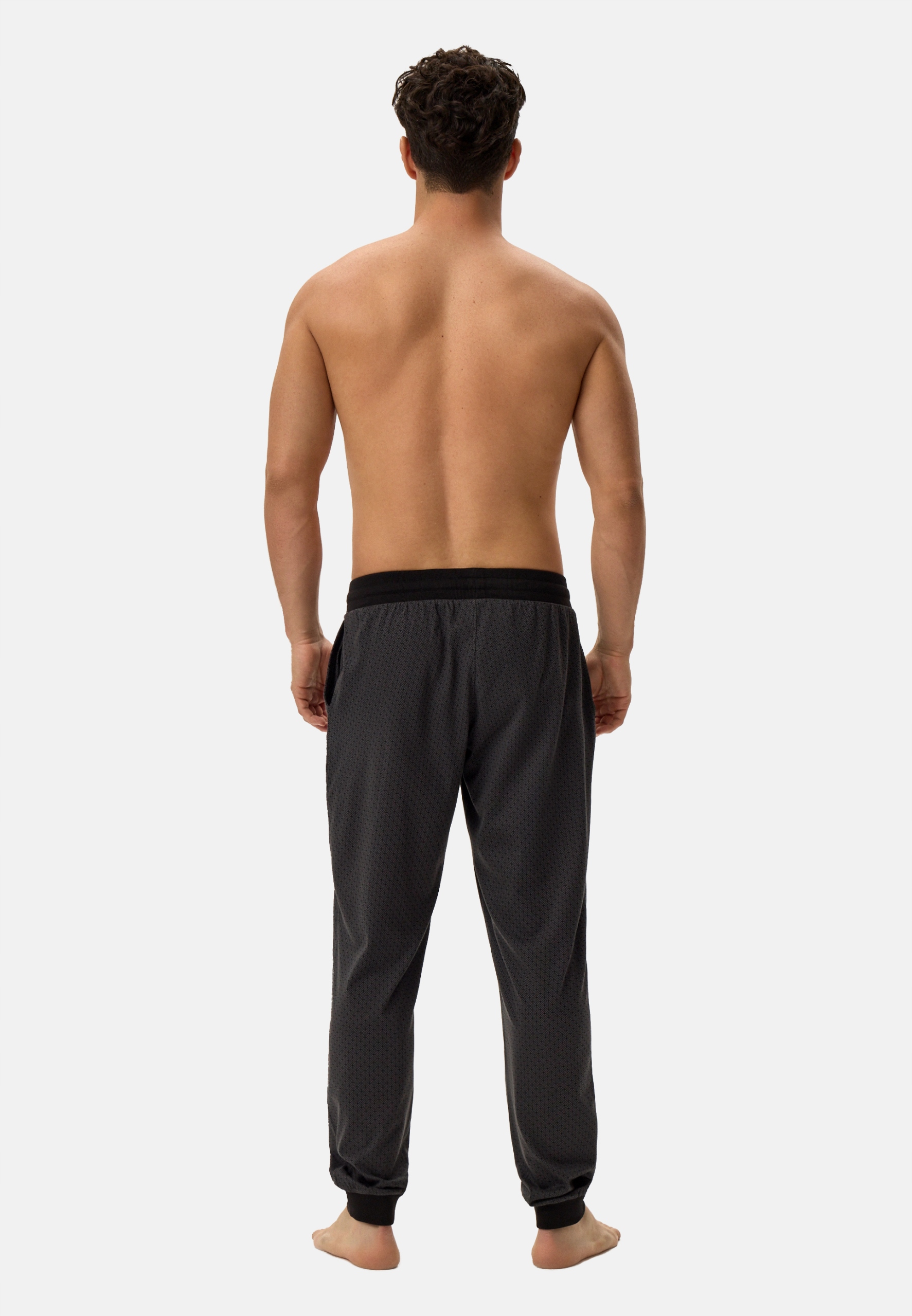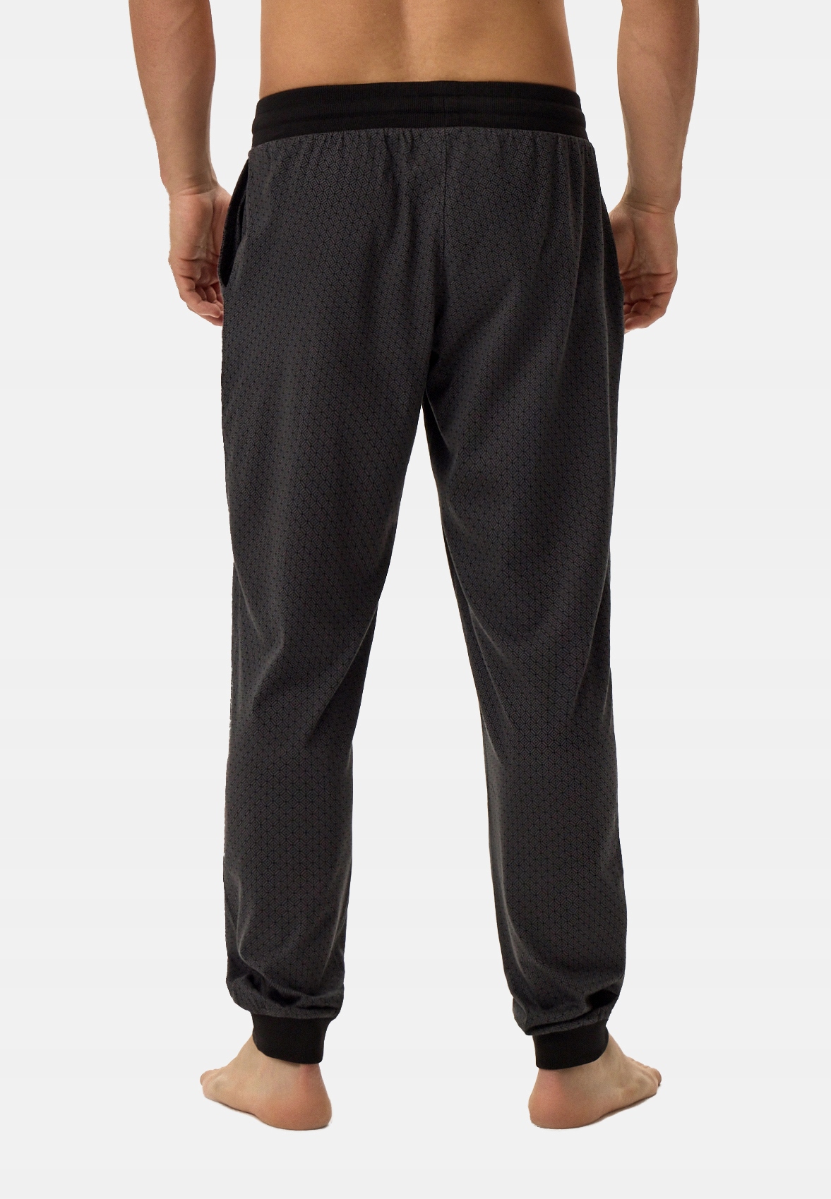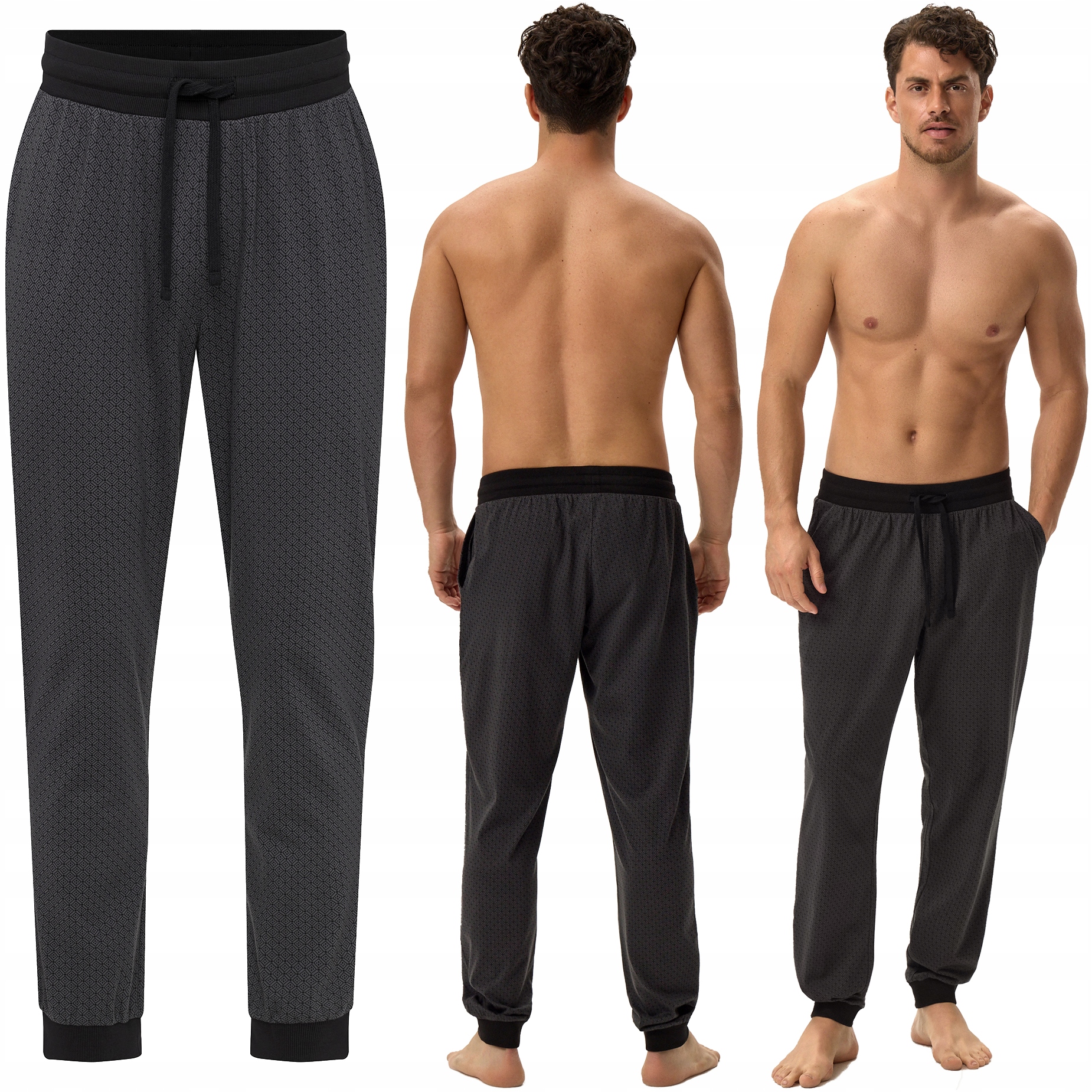 Luźne, przewiewne, męskie spodnie ze 100% bawełny, marki HENDERSON. Zapewniają pełną swobodę podczas snu jak i wciągu dnia, idealne do domowego odpoczynku. Dzięki sznurkom w pasie łatwiej dopasować je do sylwetki. Nieuciskające ściągacze w kostkach trzymają ciepło oraz nogawki na miejscu. Dodatkowo spodnie wyróżniają się geometrycznym printem z literą H.