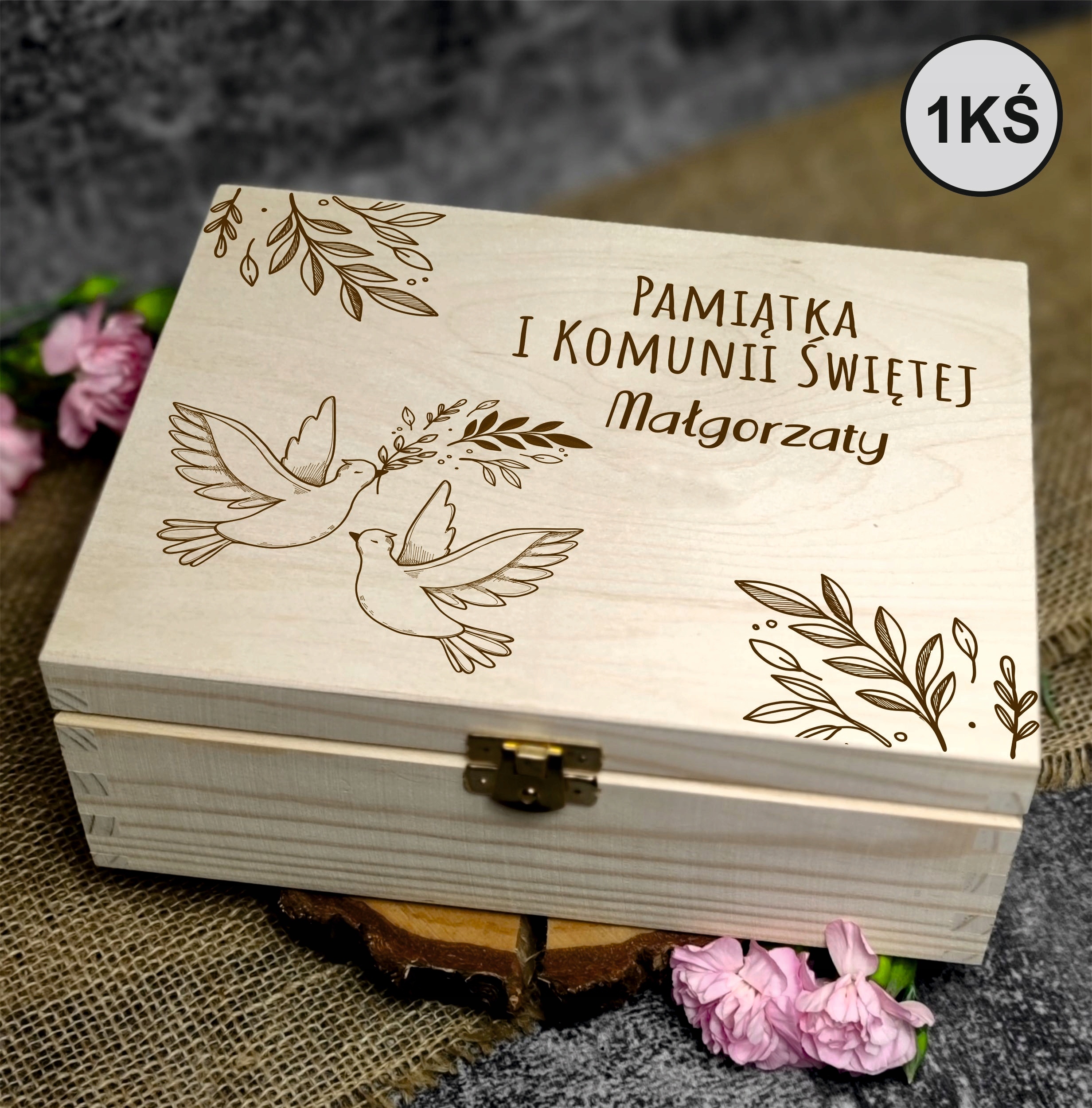 Niezbędnik na Komunię Świętą z dwoma motywami to wyjątkowy prezent, który łączy w sobie elegancję i funkcjonalność. Wykonany z naturalnego drewna, posiada pięć przegródek wypełnionych eko wiórkami kraft w kolorze białym oraz grawerowane drewniane kółeczka. To nie tylko praktyczne pudełko do przechowywania pamiątek związanych z pierwszą Komunią Świętą, ale również unikalny sposób na uwiecznienie tego ważnego dnia. Personalizacja imieniem i datą sprawia, że prezent staje się jeszcze bardziej osobisty. Zapewnij dziecku niezapomnianą pamiątkę, która kultywuje ducha tej uroczystości w elegancki i wyjątkowy sposób.