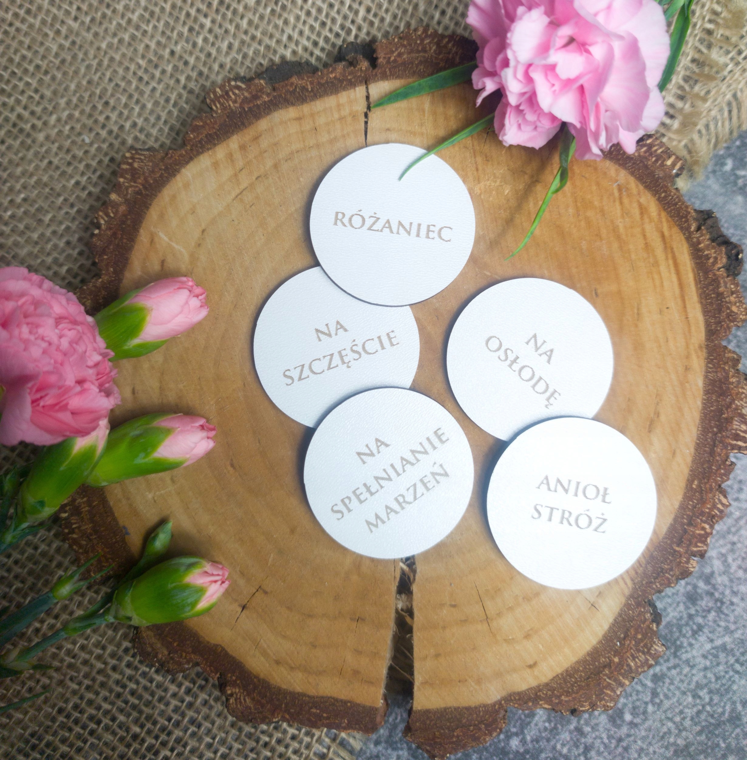 Zestaw zawiera grawerowany niezbędnik z życzeniami wraz z eko wiórkami w kolorze białym oraz 5 szt drewnianych grawerowanych kółeczek.