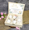 W pudełku znajduje się 5 przegródek wypełnionych eko wiórkami w kolorze białym, w których należy umieścić odpowiednie przedmioty. Do pudełka dołączonych jest 5 szt drewnianych kółeczek z grawerowanymi napisami. Grawery na kółeczkach są stałe i nie podlegają modyfikacjom.