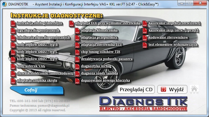(инструкции, расположение диагностических разъемов в отдельных автомобилях, диагностические советы, в в том числе: стирание инспекций обслуживания и масла, коды неисправностей.) и наш авторский программа: помощник по установке и настройке устройства версии 2.47, с технологией Click