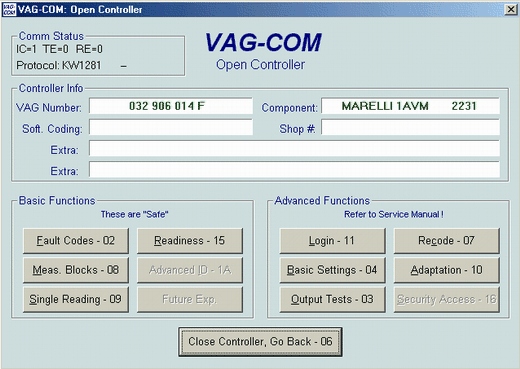После подключения к контроллеру вы можете выбрать основные функции, которые нас интересуют (например, чтение кодов неисправностей, измерительные блоки, однократное считывание) или расширенные функции (например, кодирование, настройки основные, выполнение адаптации исполнительных элементов, тестирование исполнительных элементов).