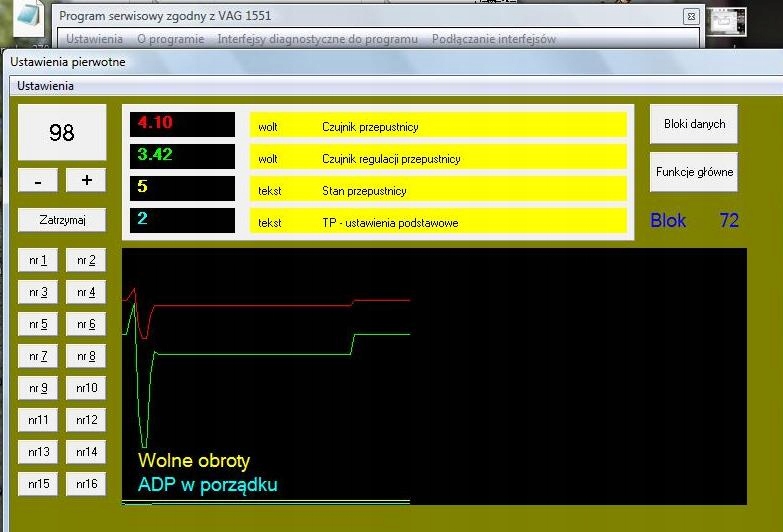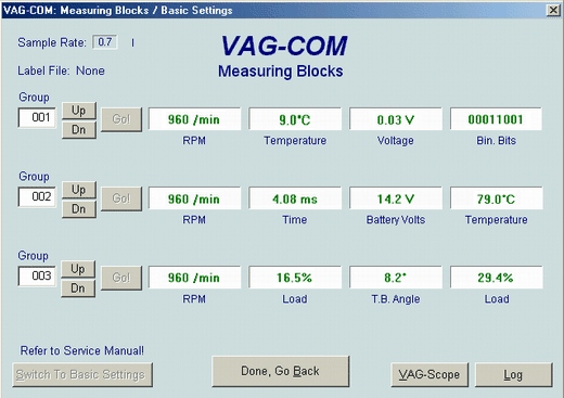 На следующем рисунке показано действие функции "измерительные блоки". Диагностируемая машина Skoda Octavia 1.6 ' 99r. таким простым способом можно проверить любой автомобиль концерна VAG. Стоить садитесь в машину, включайте программу и совершайте тест-драйв, наблюдая за текущими параметрами работы.