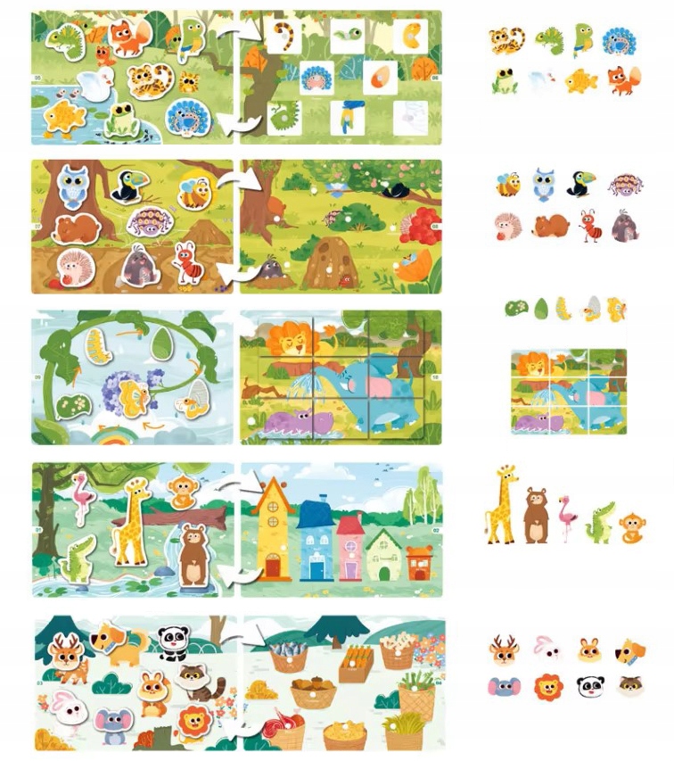 Każda strona to nowe wyzwanie – maluch dopasowuje zwierzątka do odpowiednich miejsc, uczy się rozpoznawania kształtów, kolorów oraz nazw zwierząt. Książeczka świetnie sprawdzi się w domu, w podróży, na spacerze czy w poczekalni – jest lekka, kompaktowa i pełna zabawy!