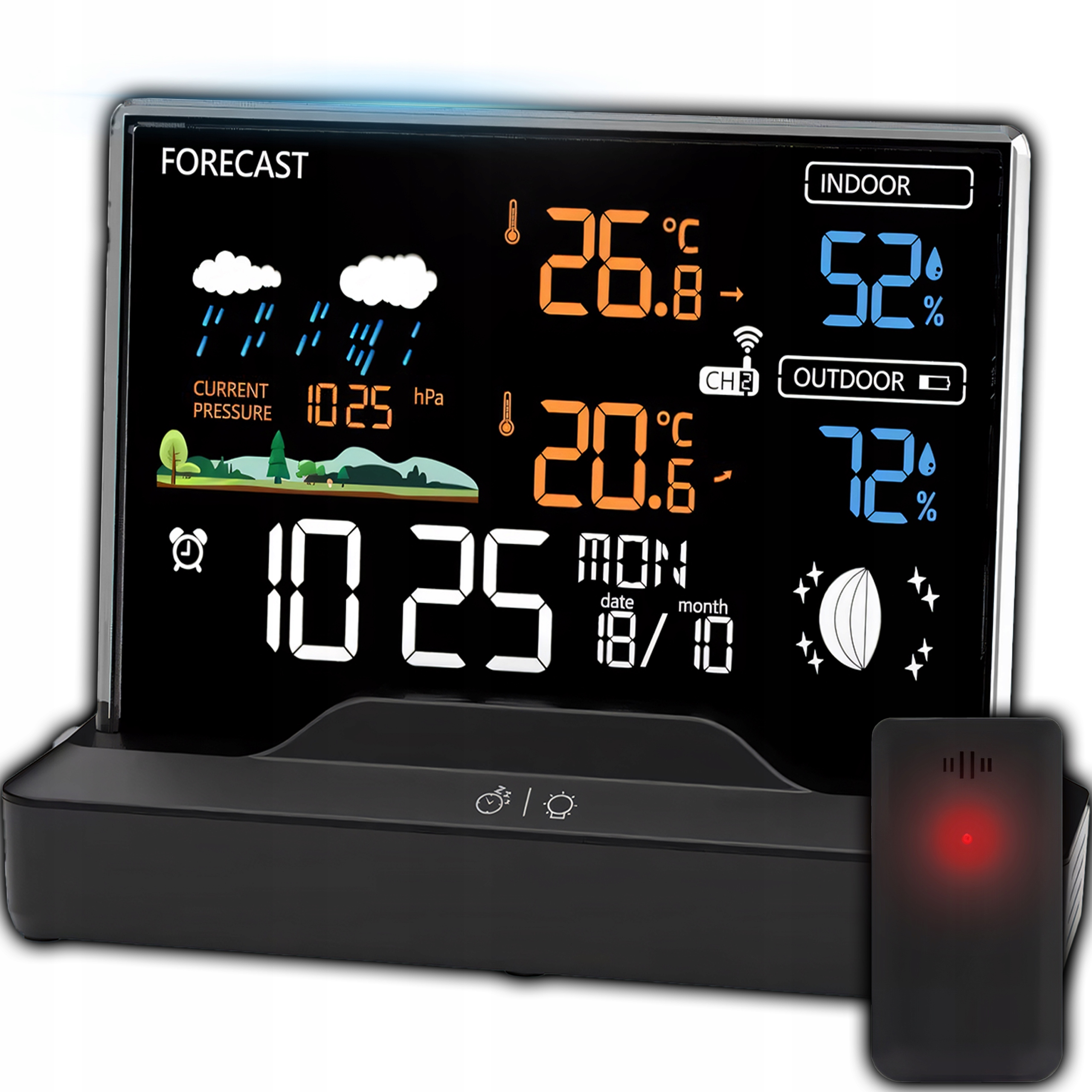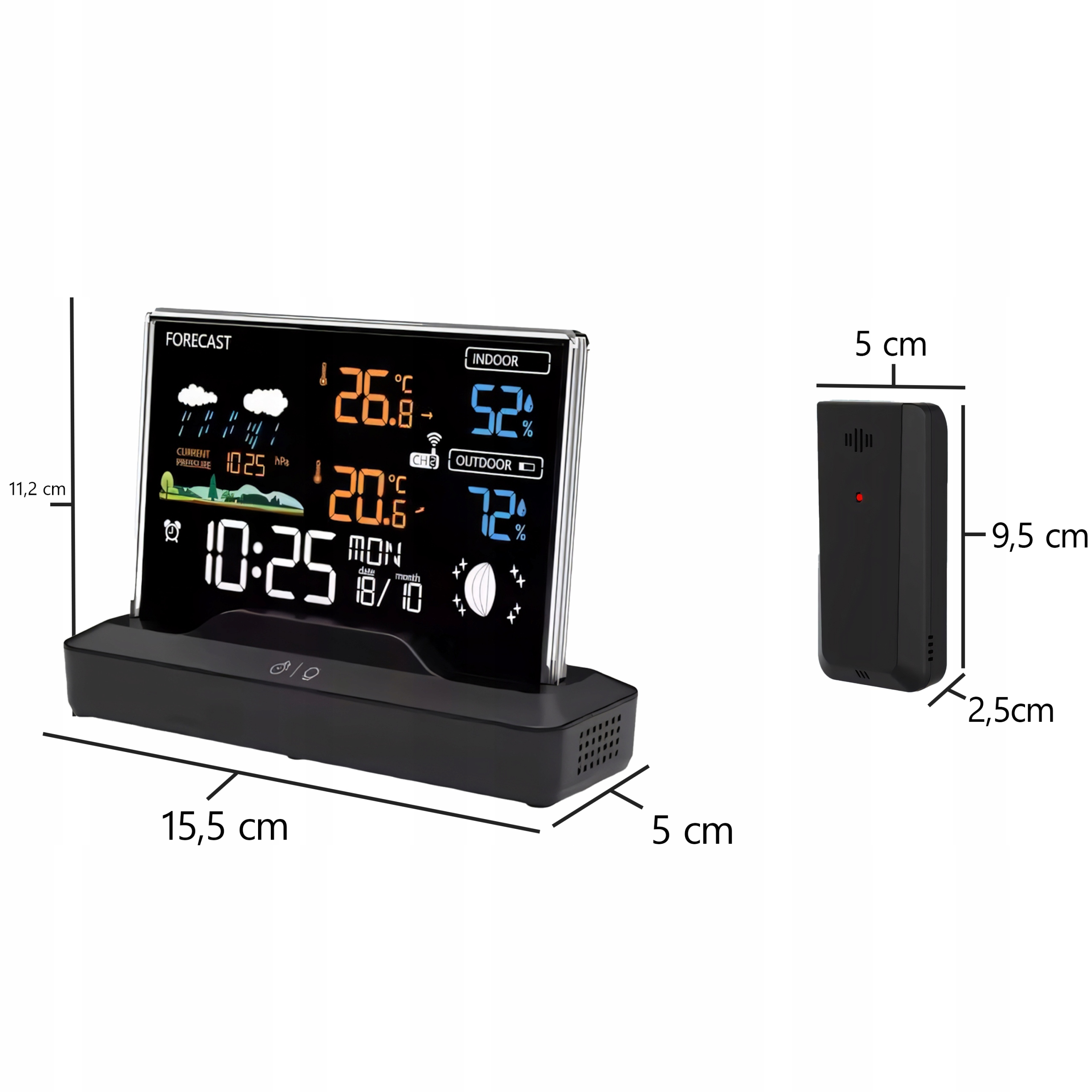 ✔️ Stacja pogodowa oferuje wiele funkcji, takich jak termometr, higrometr, barometr, prognoza pogody oraz wyświetlanie faz księżyca. Dzięki zewnętrznemu czujnikowi o zasięgu 80 metrów urządzenie pozwala na monitorowanie warunków atmosferycznych zarówno wewnątrz, jak i na zewnątrz. Dokładne i bieżące dane zapewniają pełną kontrolę nad otoczeniem.
