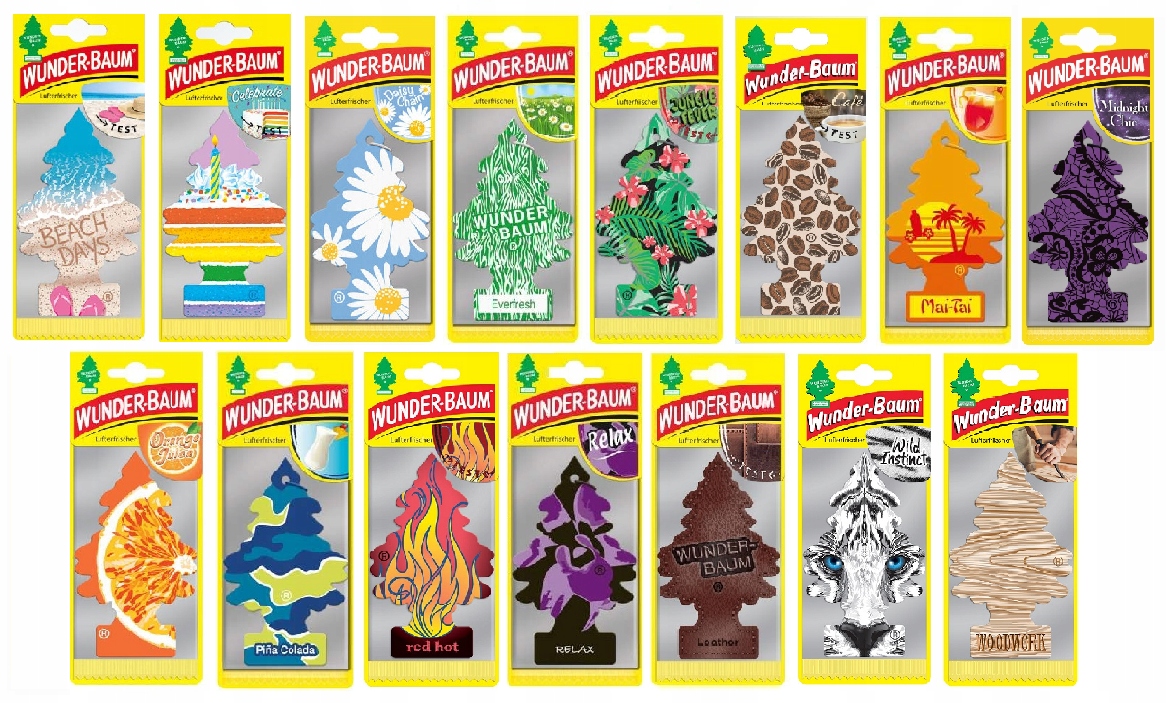 Choinki Wunder Baum są znane i dostępne na całym świecie i cieszą się ogromną popularnością. W ofercie znajduje się kilkanaście rodzajów drzewka o różnych nutach zapachowych, spośród których każdy z pewnością wybierze odpowiedni zapach dla siebie.