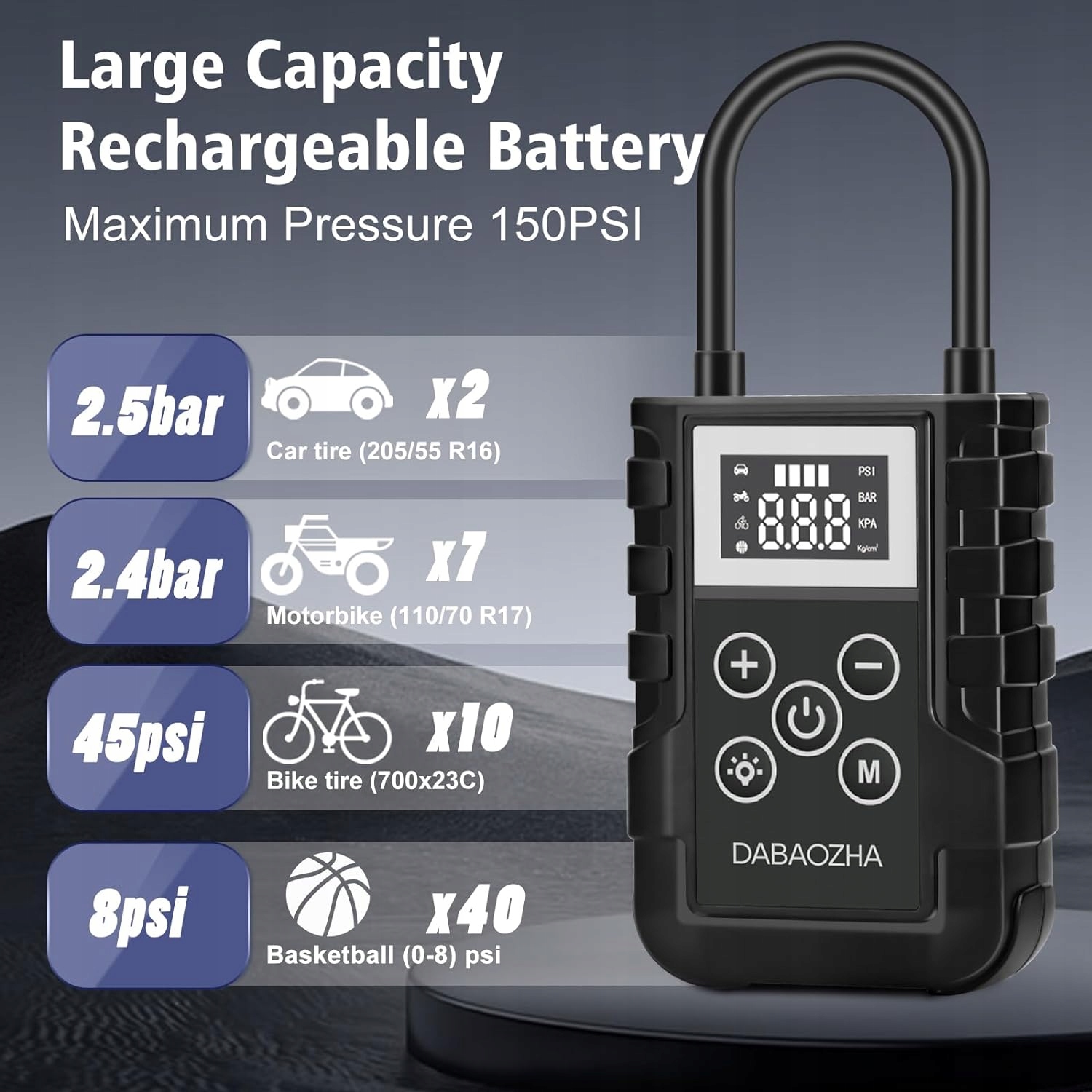 Akumulator o dużej pojemności: ta przenośna mini pompka powietrza jest wyposażona w akumulator o pojemności 6000 mAh i ma ekran LED z symbolem wskaźnika energii, aby ładować się na czas, gdy dostępna jest tylko jedna cela. Elektryczna pompka powietrza. Po pełnym naładowaniu urządzenia przez 3-4 godziny, pracuje ono nieprzerwanie przez 25 minut.