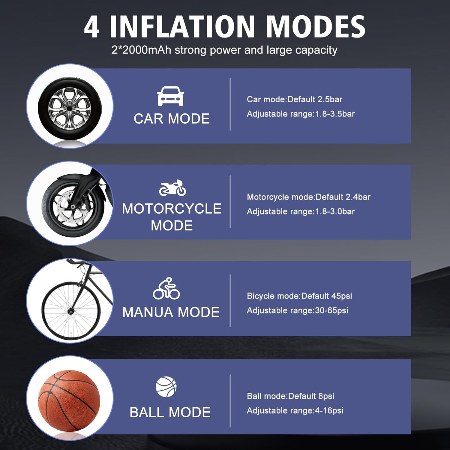 Wstępnie ustawione tryby to tryb automatyczny, tryb motocyklowy, tryb rowerowy i tryb piłki. Elektryczna pompka powietrza ma tryb ręczny, który umożliwia ustawienie żądanego ciśnienia w zakresie od 3 do 150 psi, w zależności od używanego urządzenia.