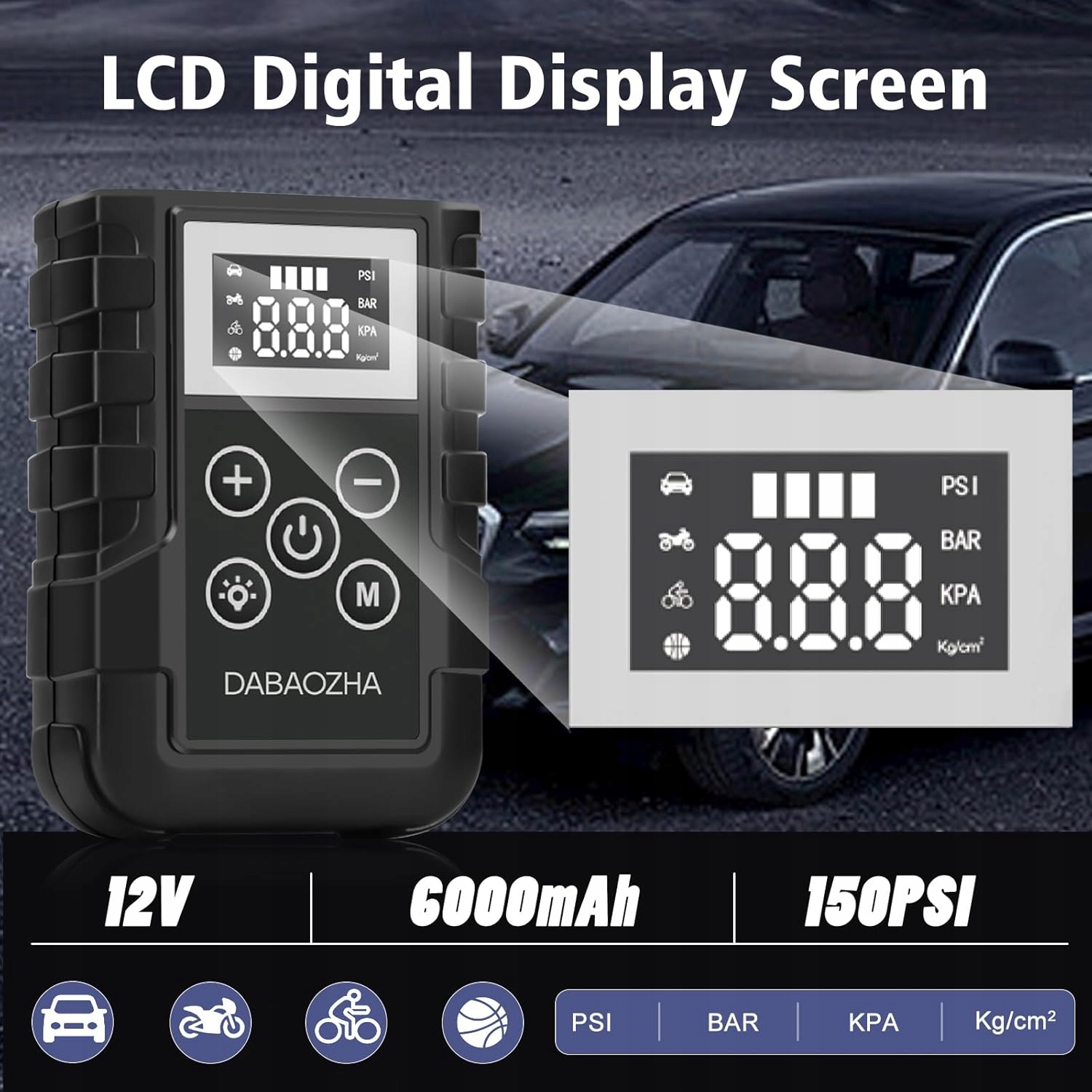 Cyfrowy wyświetlacz LED i automatyczne wyłączanie: Elektryczny kompresor powietrza ma 4 jednostki miary PSI, BAR, KPA, Kg/cm², cyfrowy monitoring ciśnienia w oponach, aby monitorować ciśnienie w oponach w dowolnym momencie i regulować wstępnie ustawione ciśnienie powietrza, wskaźnik LED, który pokazuje wartość ciśnienia w czasie rzeczywistym i wstępnie ustawioną wartość, a kompresor akumulatora automatycznie wyłącza się po napełnieniu do wstępnie ustawionego ciśnienia.