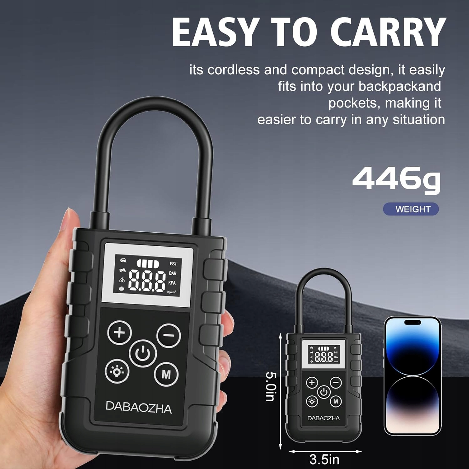 Bezprzewodowa i łatwa do przenoszenia: w porównaniu do ogromnych wymiarów konwencjonalnego kompresora powietrza, elektryczna pompka powietrza ma wymiary 12,7 x 9 x 4,5 cm, jest mała i lekka, możesz łatwo transportować tę bezprzewodową sprężarkę akumulatorową w plecaku, torbie lub konsoli środkowej samochodu i wyjmować ją, kiedy tylko chcesz jej użyć.