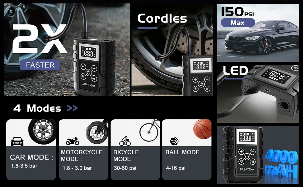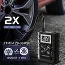 Przenośna samochodowa pompka powietrza do opon samochodowych z silnikiem o wysokiej wydajności i precyzyjnym odlewanym cylindrem może wytworzyć ciśnienie do 150 PSI i napompować opony samochodowe (205/55/r16) od 0 do 36 PSI i od 29 do 41 PSI (255/40/r20) w 8 minut, a całą oponę (255/40/40). 0/r20 0) w 10 minut.