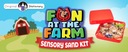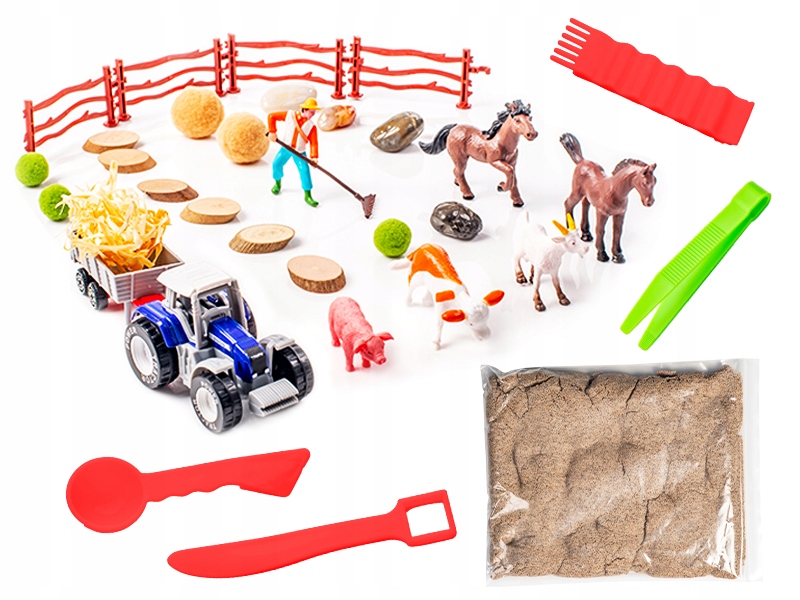 5 zwierząt gospodarskich, 1 rolnik, 1 traktor, prawdziwe kamienie, wióry drewniane, elementy ogrodzeniowe i naturalny łyk, którego można używać jako małe bele siana