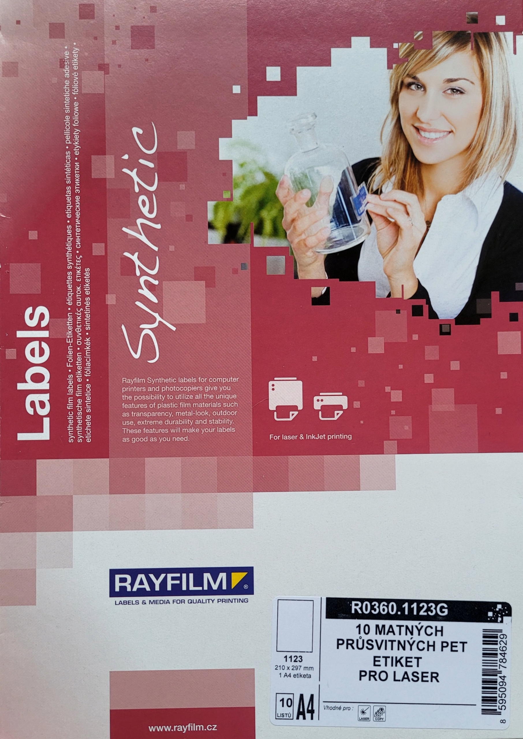 Folia samoprzylepna transparentna mat poliestrowa PET o grubości 58 mikronów i gramaturze 60g/m2 na białym podkładzie papierowym o gramaturze 100 g/m2. Materiał stosuje się do wydruków we wszystkich drukarkach laserowych i kopiarkach. Odporna na warunki atmosferyczne.