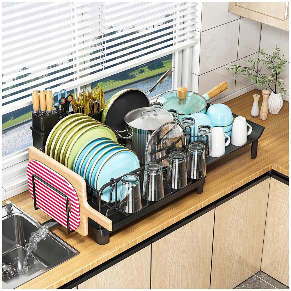 Ten 2-poziomowy duży stojak na naczynia jest zdejmowany, można zdemontować górny stojak i używać górnego stojaka i dolnego w różnych miejscach, które lubisz. Wykorzystaj w pełni przestrzeń kuchenną, taką jak blaty, parapety i narożniki.