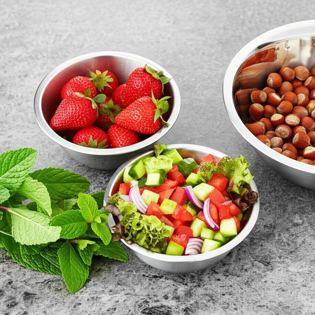 Wybierając ten zestaw, stawiasz na wytrzymałość i bezpieczeństwo. Stal nierdzewna nie pochłania zapachów, nie odbarwia się i nie reaguje z żywnością – nawet z kwaśnymi składnikami. Dzięki gładkiej powierzchni miski są bardzo łatwe do mycia – ręcznie lub w zmywarce. To inwestycja, która naprawdę się opłaca.