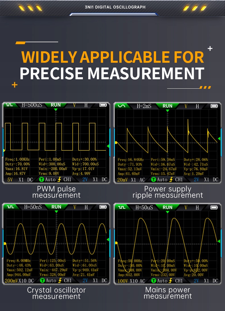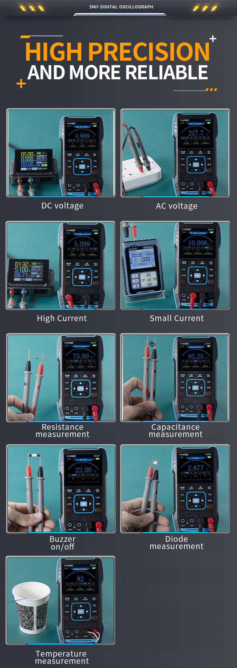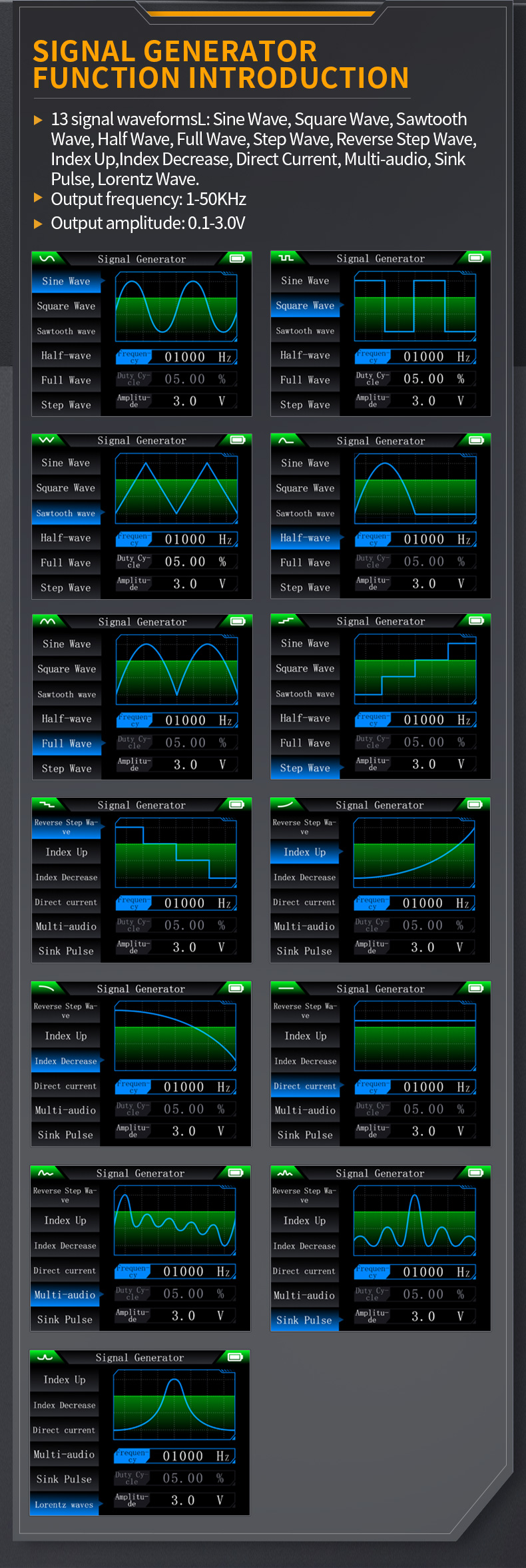 Wbudowany generator sygnału funkcyjnego DDS może generować 13 typów sygnałów funkcyjnych, z maksymalną częstotliwością wyjściową 50 kHz i krokiem 1 Hz. Częstotliwość wyjściowa, amplituda i cykl pracy są regulowane. Wyposażony jest w 2,8-calowy ekran LCD o rozdzielczości 320*240 i wbudowany akumulator litowy 3000 mAh o czasie czuwania do 6 godzin. Jego kompaktowy rozmiar zapewnia użytkownikom bardziej zaawansowane funkcje praktyczne i doskonałą przenośność.