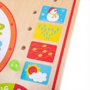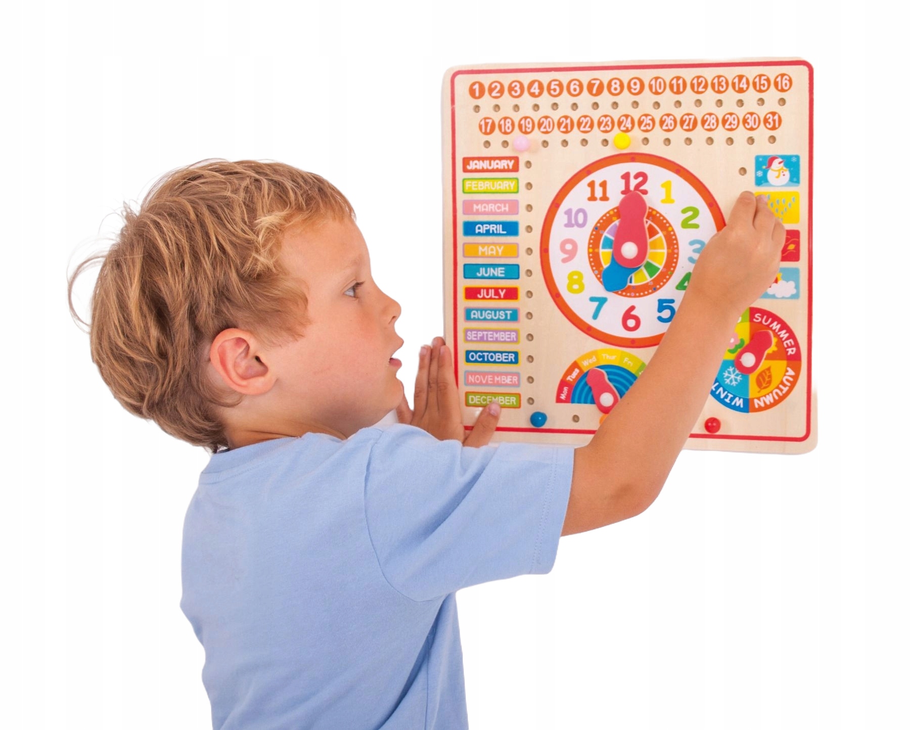 Na samej górze znajdują się liczy od 1-31, więc umieszczamy kołeczek pod liczbą, która wskazuje aktualny dzień miesiąca. Po lewej stronie tablicy zaznaczamy kołeczkiem aktualny miesiąc. Można go odczytać i zapamiętać dzięki słowu mieszczącemu się na kolorowym pasku. Pośrodku dziecko znajdzie na tej tablicy zegar z ruchomymi wskazówkami. Daje się tutaj ustawić aktualny czas. Po prawej stronie, przy małych obrazkach, zaznaczymy ponownie kołeczkiem pogodę widzianą przez okno, a poniżej można wskazówką ustawić aktualną porę roku i zapamiętać jej nazwę w języku angielskim. Pod zegarem ponownie wskazówką ustawiamy bieżący dzień tygodnia. Zapisano go na tablicy skrótem, ale z pewnością ktoś z dorosłych podpowie maluszkowi, jak należy powiedzieć nazwy dni po angielsku.