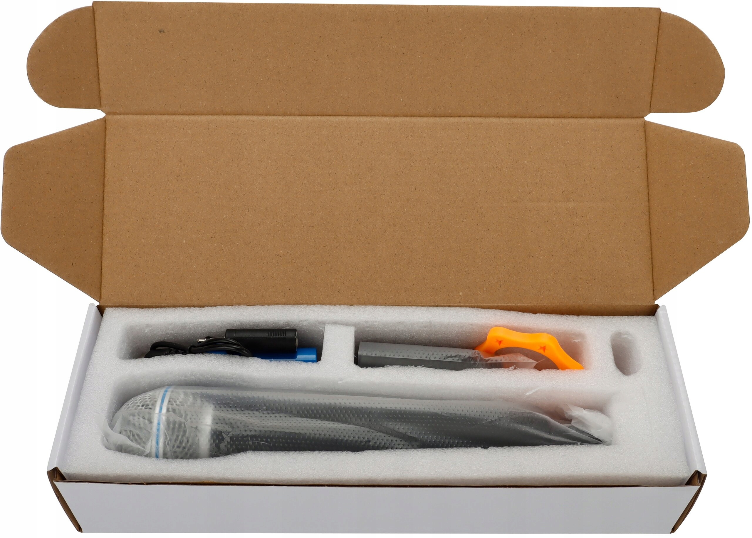 W opakowaniu znajduje się: mikrofon SONICSOUL DM-581, odbiornik (złącze 6,3 mm), adapter 3,5mm, 2 x bateria LI-ON, 1 x ring antypoślizgowy, 1 x kabel USB-C/USB-A oraz dokumentacja.