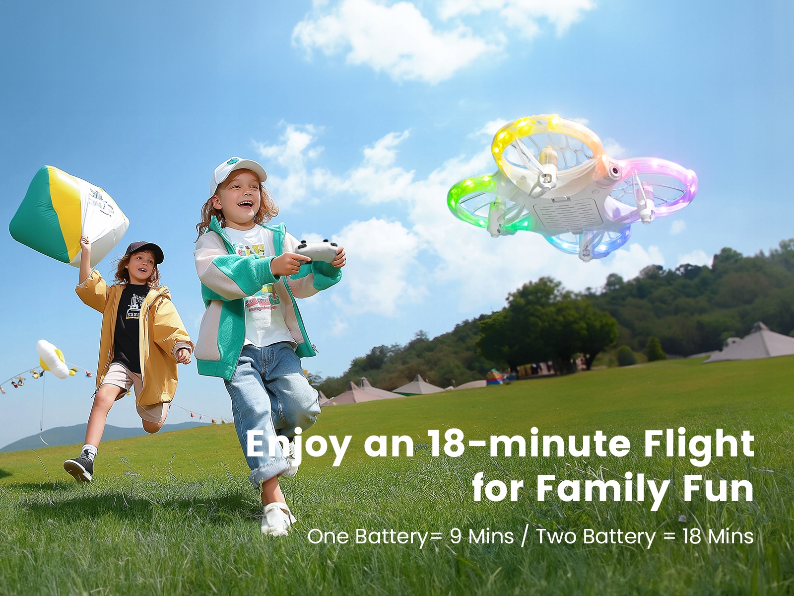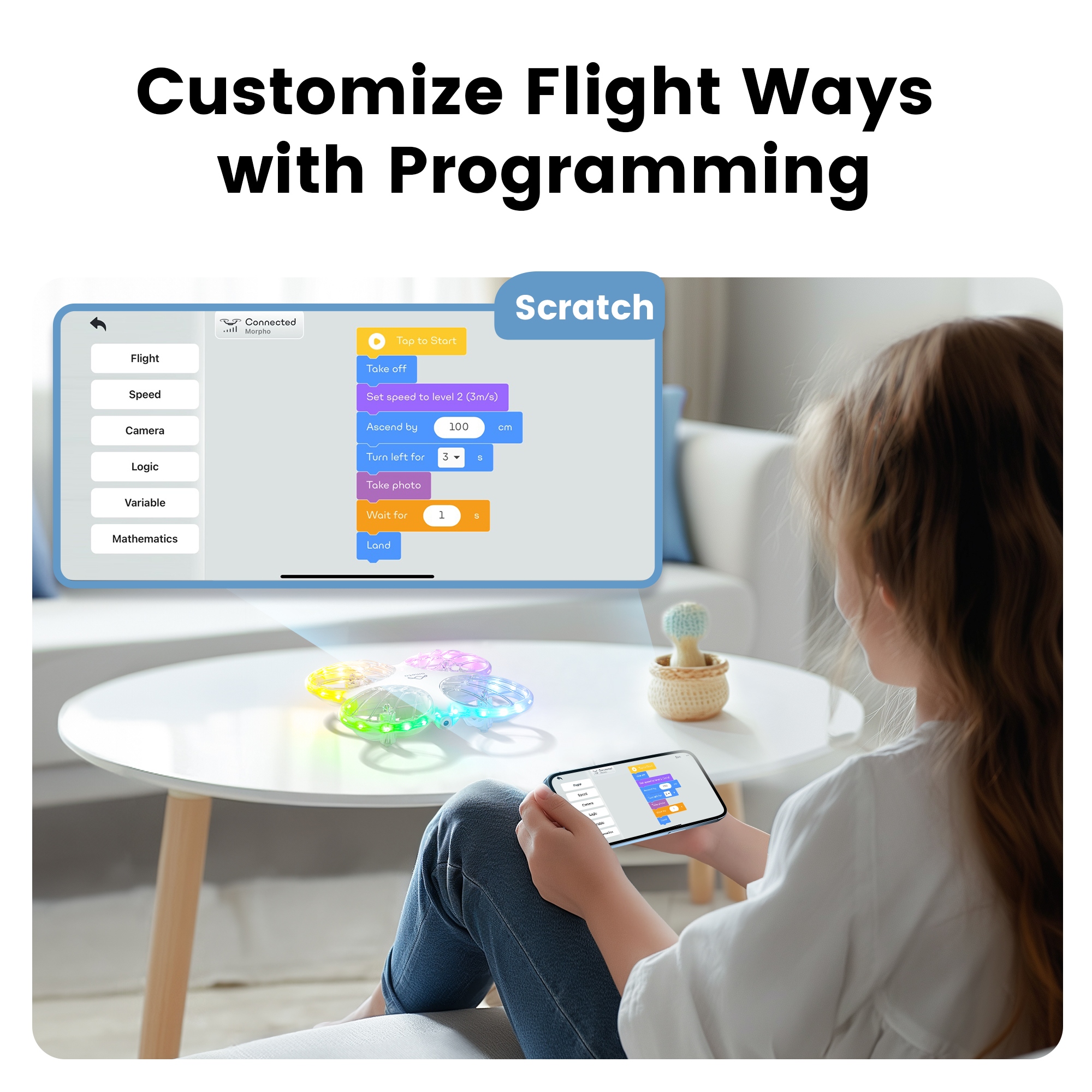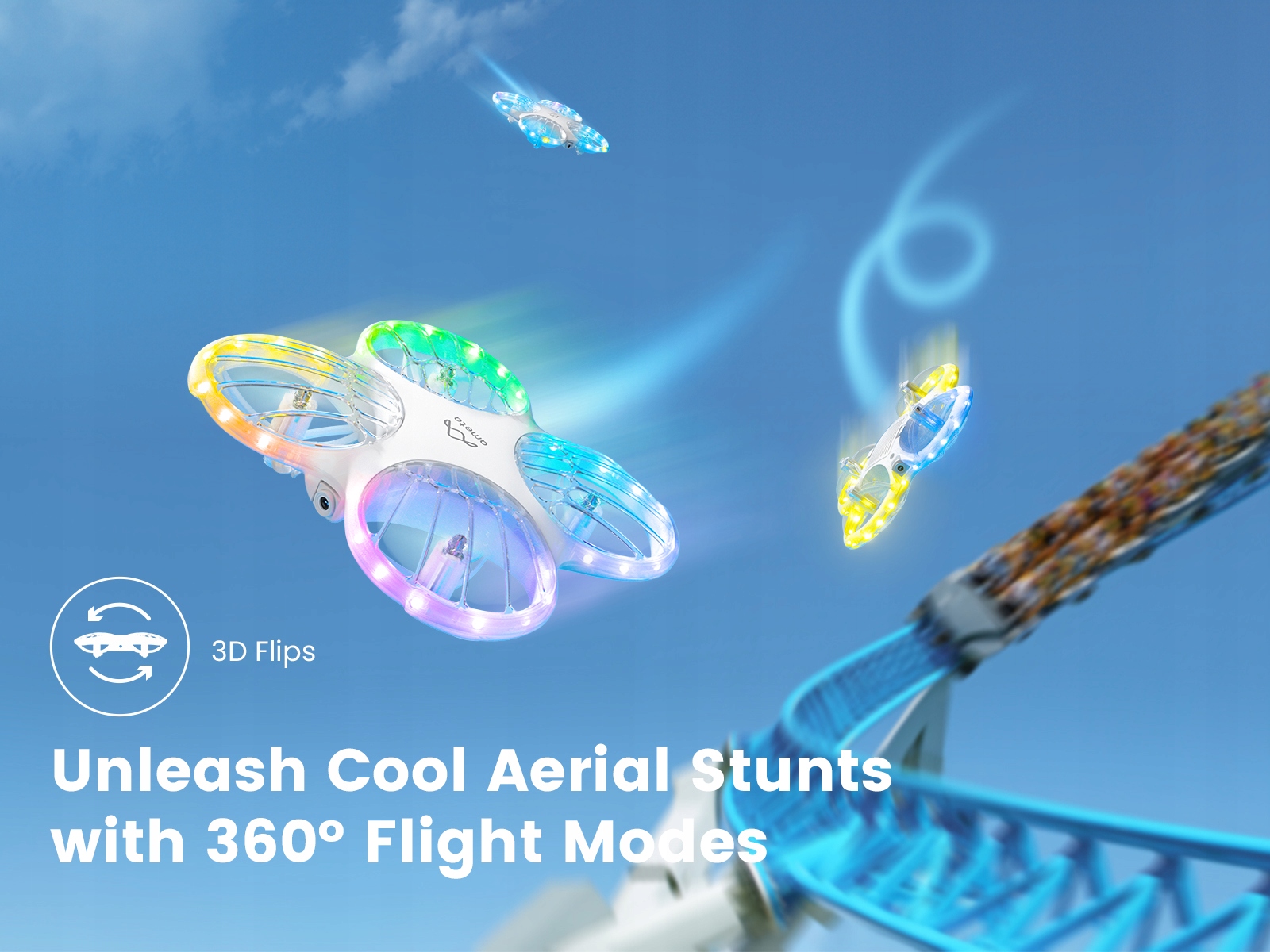 Dron Morpho posiada 32 światła RGB oferujące 6 żywych efektów świetlnych, tworząc niepowtarzalne wrażenia z lotu. Dzięki przewrotom o 360° i funkcji lotu okręgiem idealnie nadaje się do rozrywki dzieci i zwierząt domowych w ogrodzie.