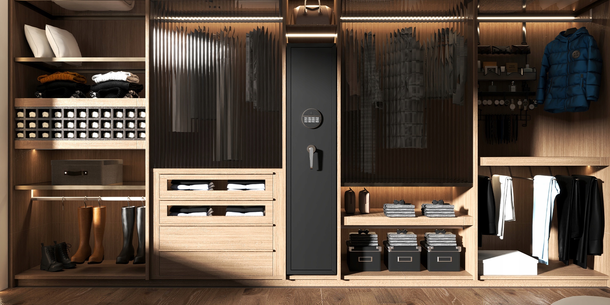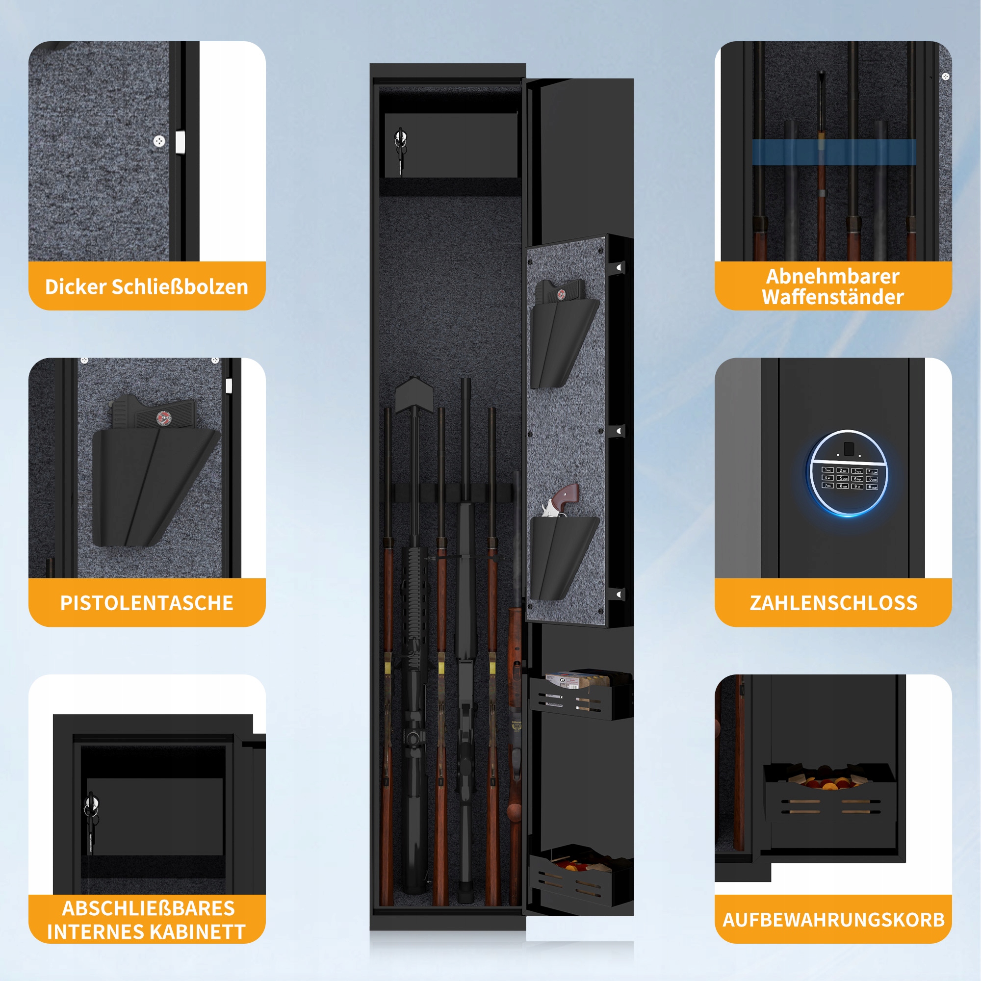 Szafka na 5 sztuk broni długiej, sejf na karabiny i pistolety, sejf na strzelby, szybki dostęp. Nadaje się do bezpiecznego przechowywania długiej broni i amunicji. Wysokość 138 cm × szerokość 30 cm × głębokość 30 cm