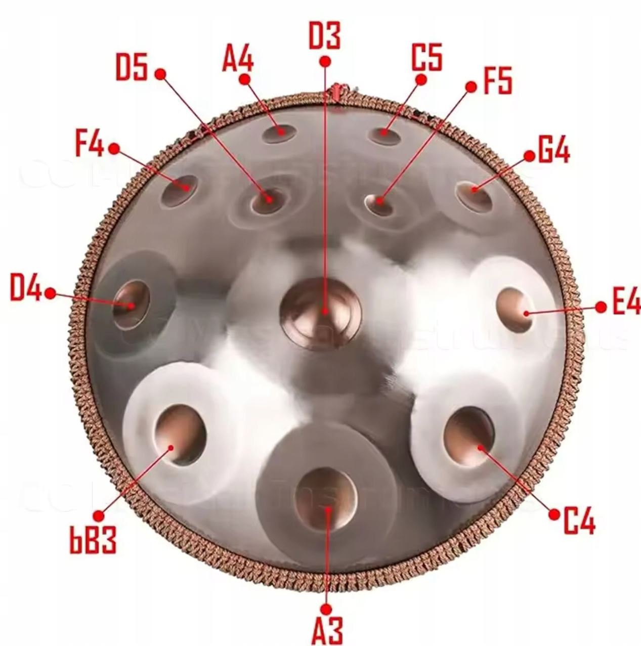 Ręcznie Wykonany Bęben Handpan D-moll Kurd –12 Dźwięków, 432Hz, 56 cm, Profesjonalna Wersja z Plecionym Brzegiem z Rotangu