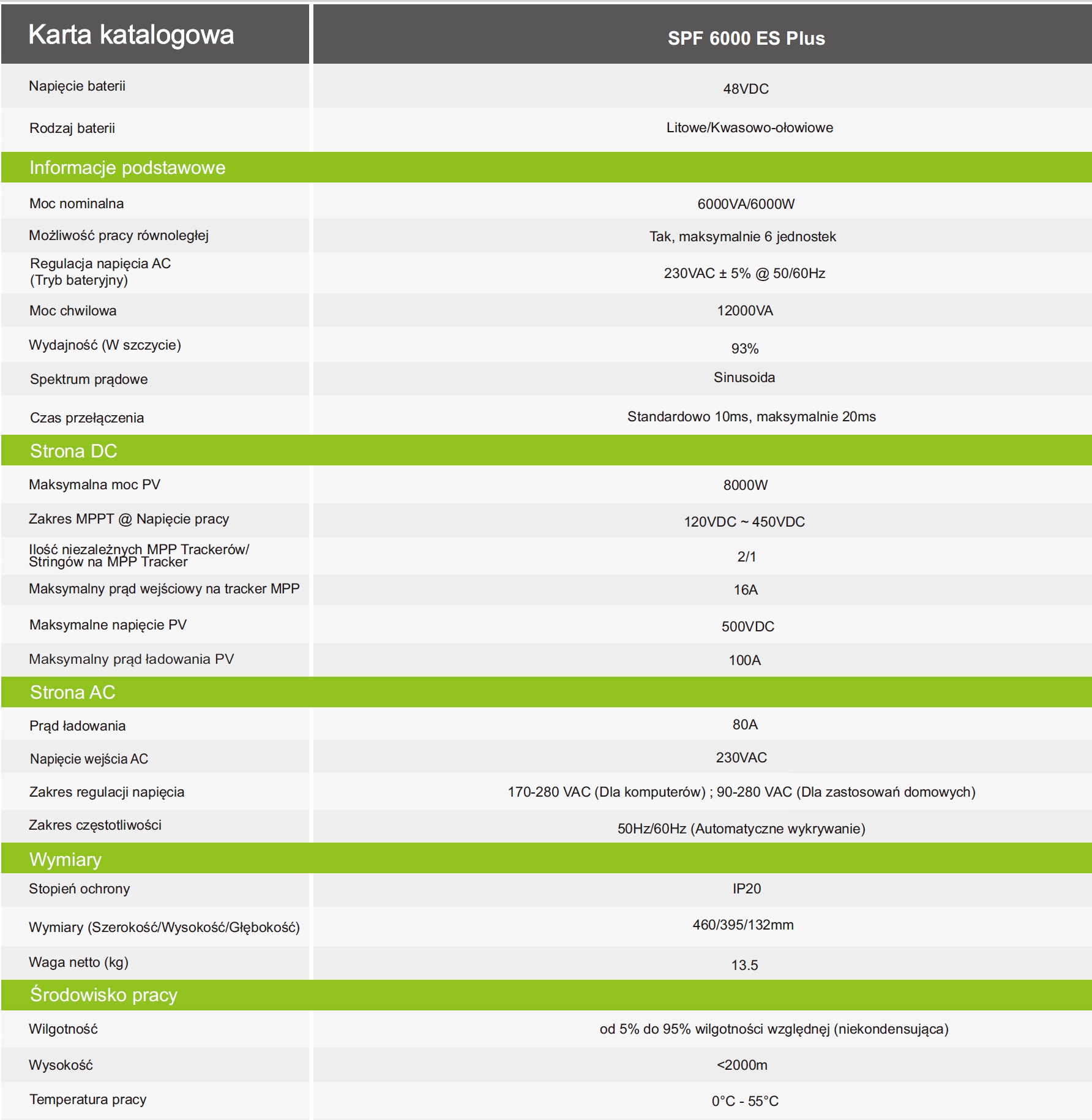 Polska dystrybucja - nowe, nieużywane inwertery Growatt SPF 6000 ES Plus; 6kW; 230V falowniki solarne off grid 48V, niskonapięciowe.