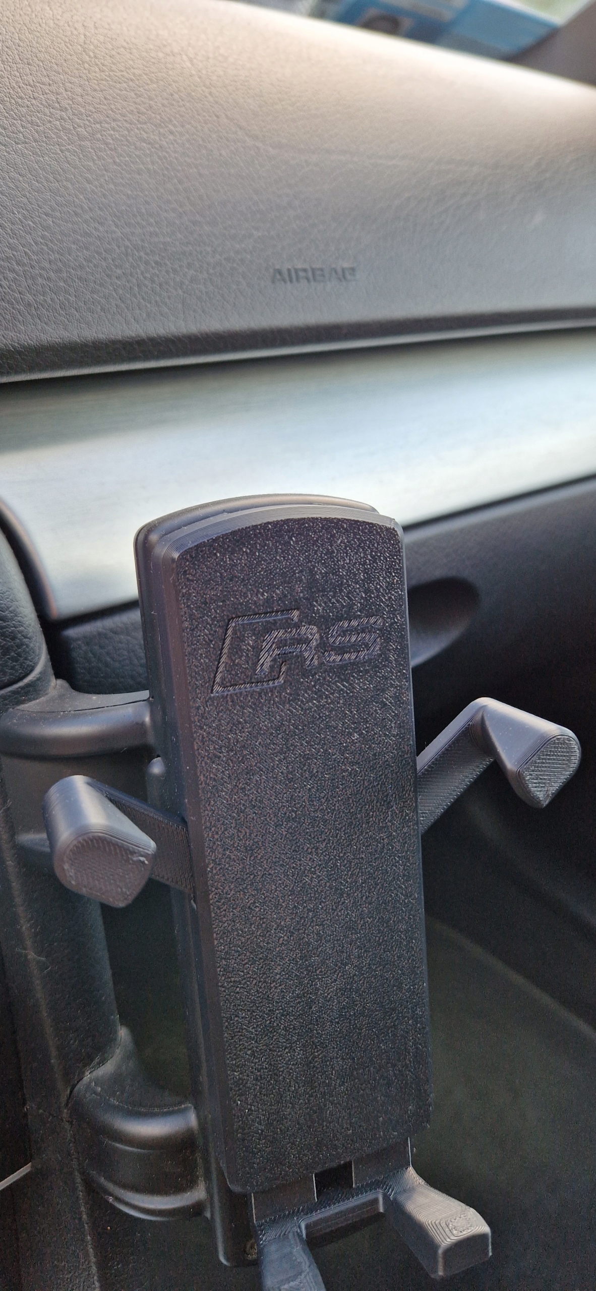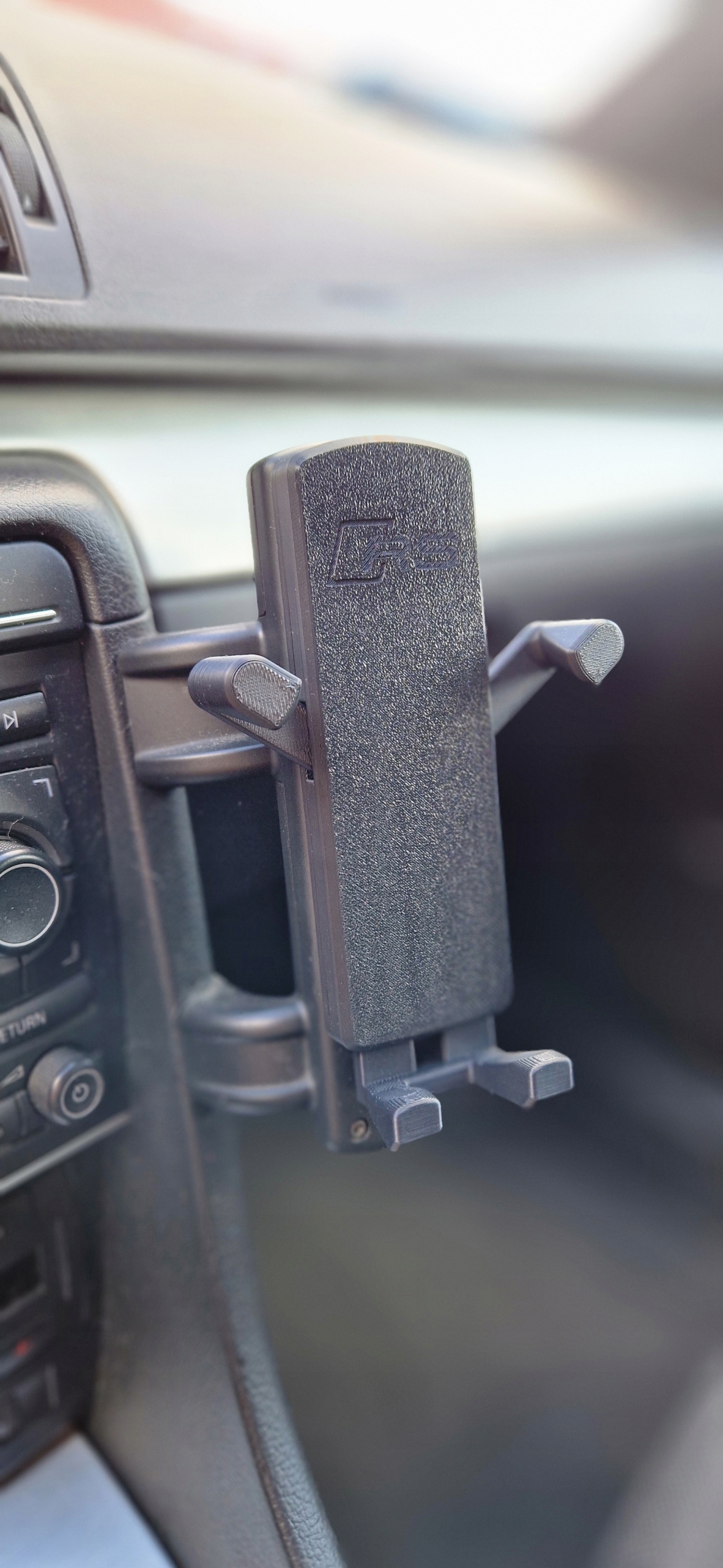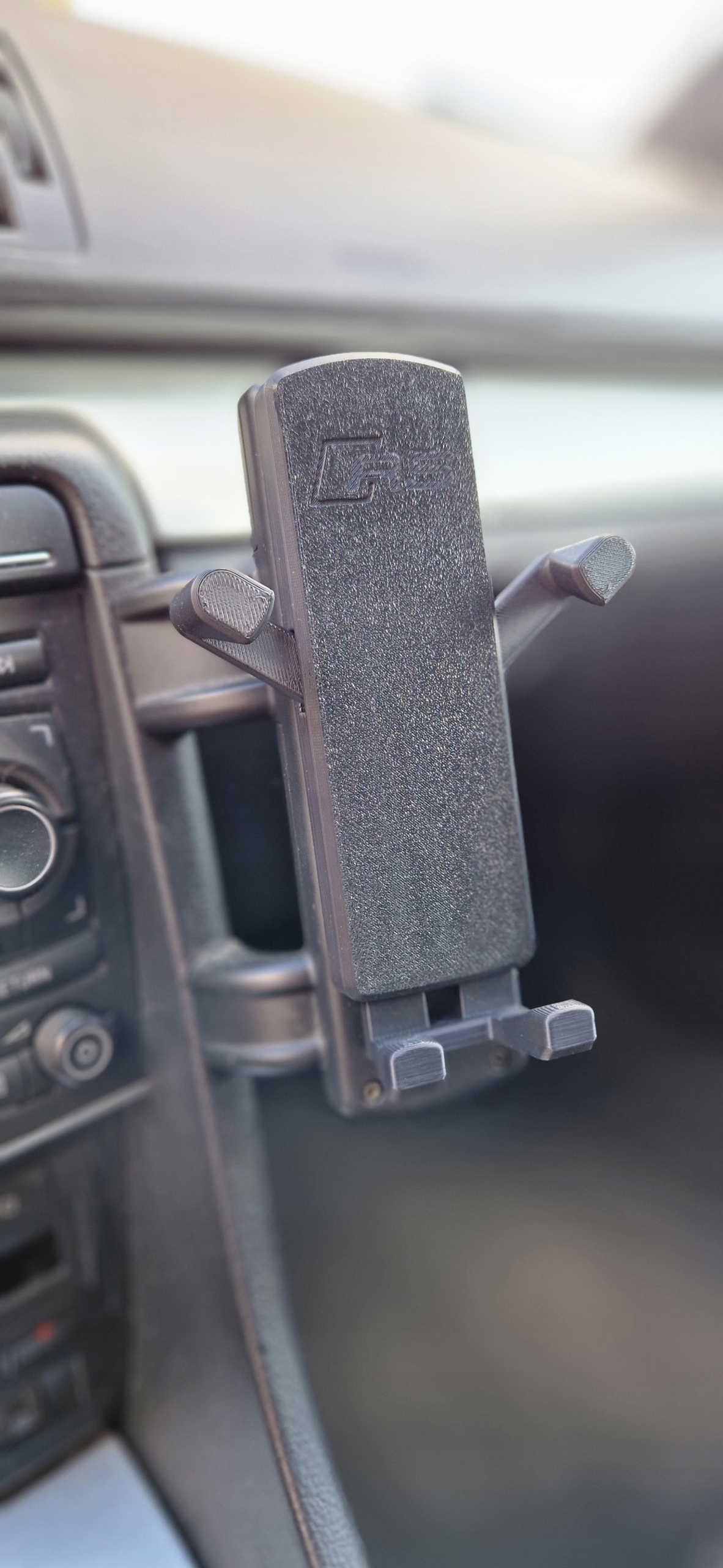 ✅ **Uniwersalny mechanizm zaciskowy** – telefon jest stabilnie utrzymywany pod własnym ciężarem, co pozwala na montaż urządzeń o dowolnym rozmiarze ekranu i grubości.