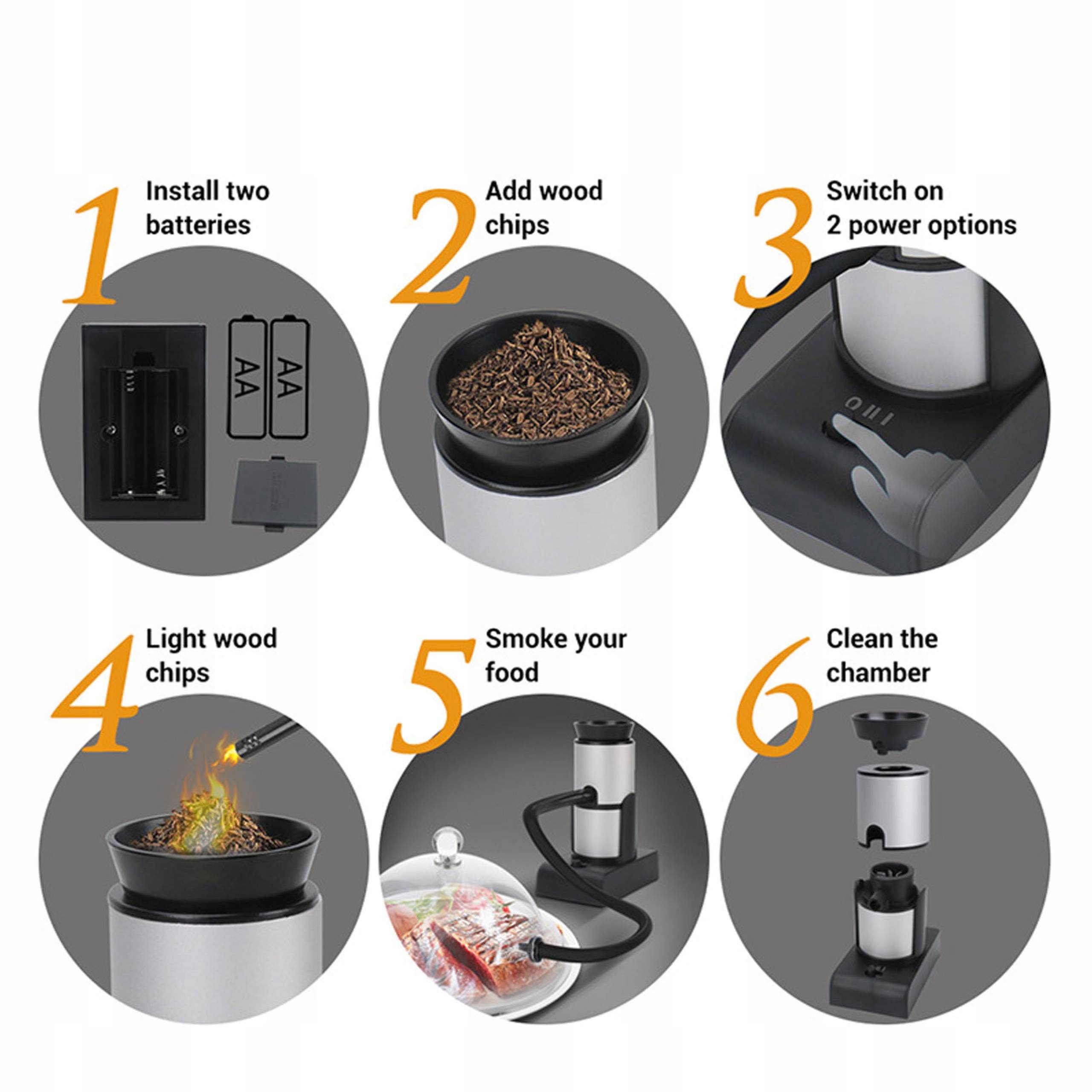 Lista pakietów: 1 x wędzarnia żywności (bateria nie jest dołączona) 1 x śrubokręt 1 x wąż 1 x pędzel 2 x Filtr 1 x Instrukcja 1 x dysza