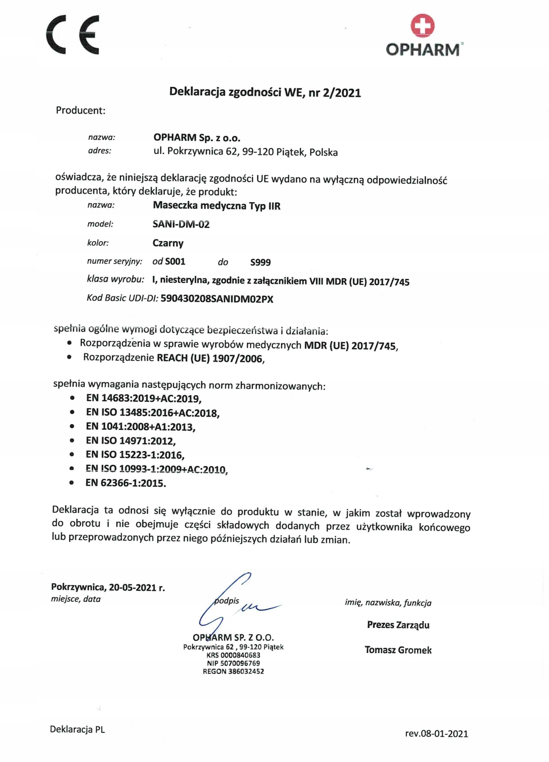 Медицинский продукт соответствует стандарту EN: 14683: 2019, заявлено в ведомство Регистрация лекарственных средств и биоцидов.